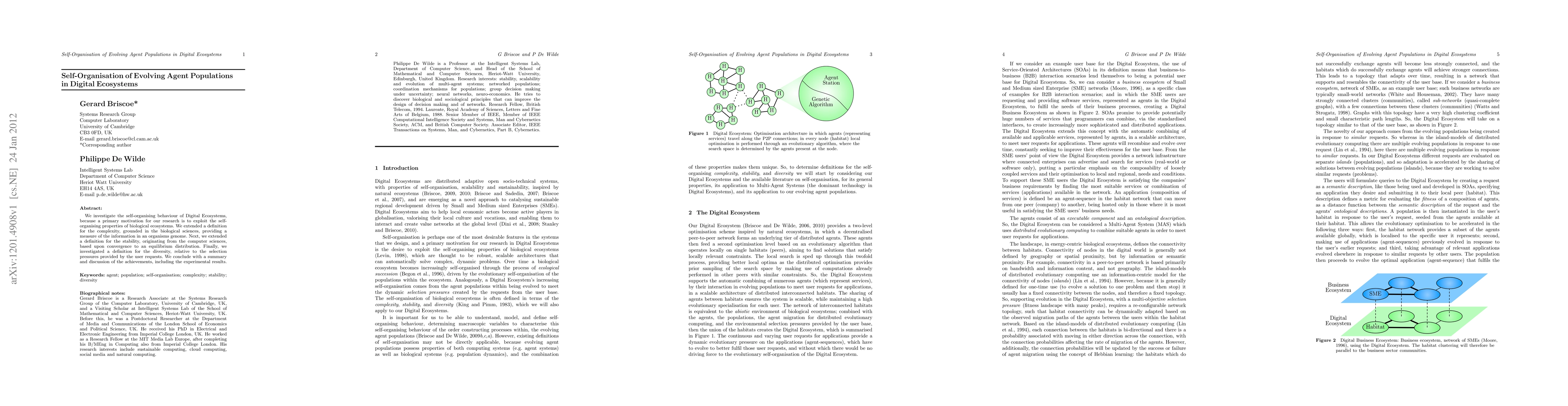 This work stands out by merging concepts from biological sciences with digital systems, specifically focusing on the self-organization of evolving agent populations, which has not been extensively explored in existing literature.