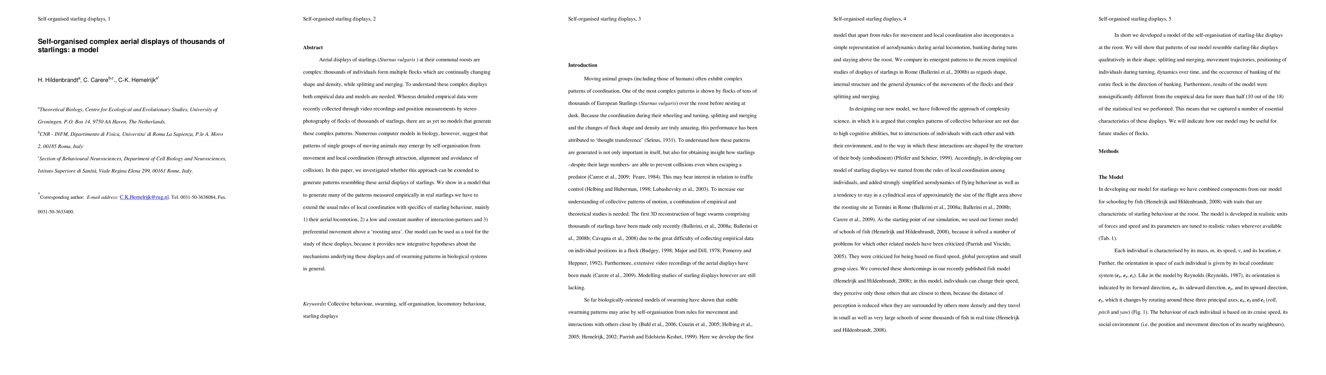 Aerial displays of starlings (Sturnus vulgaris) at their communal roosts are complex: thousands of individuals form multiple flocks which are continually changing shape and density, while splitting and merging. To understand these complex displays both empirical data and models are needed. Whereas detailed empirical data were recently collected through video recordings and position measurements by stereo photography of flocks of thousands of starlings, there are as yet no models that generate these complex patterns. Numerous computer models in biology, however, suggest that patterns of single groups of moving animals may emerge by self-organisation from movement and local coordination (through attraction, alignment and avoidance of collision). In this paper, we investigated whether this approach can be extended to generate patterns resembling these aerial displays of starlings. We show in a model that to generate many of the patterns measured empirically in real starlings we have to extend the usual rules of local coordination with specifics of starling behaviour, mainly 1) their aerial locomotion, 2) a low and constant number of interaction-partners and 3) preferential movement above a roosting area. Our model can be used as a tool for the study of these displays, because it provides new integrative hypotheses about the mechanisms underlying these displays and of swarming patterns in biological systems in general.