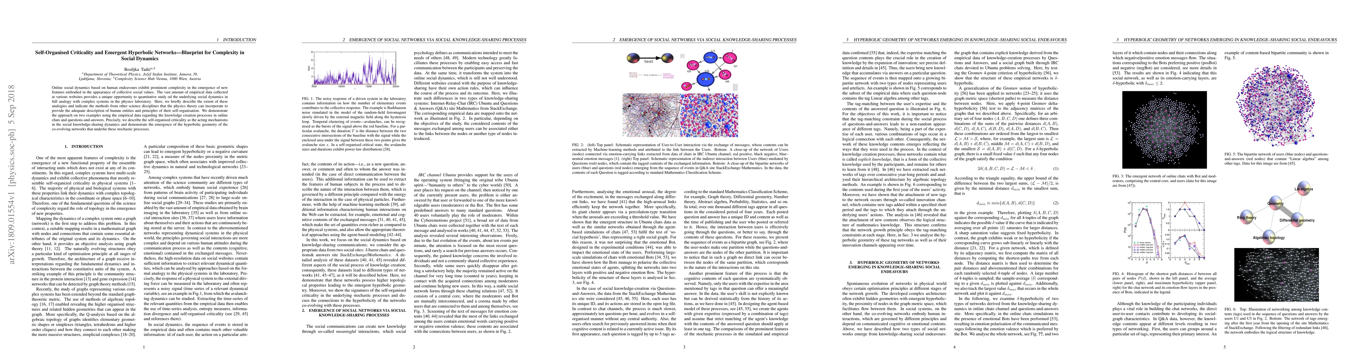 This paper explores the complexity of online social dynamics through the lens of self-organised criticality and hyperbolic network structures, drawing parallels to physical complex systems. It uses empirical data from online chats and Q&A platforms to illustrate how these principles describe human self-organisation and knowledge-sharing dynamics.