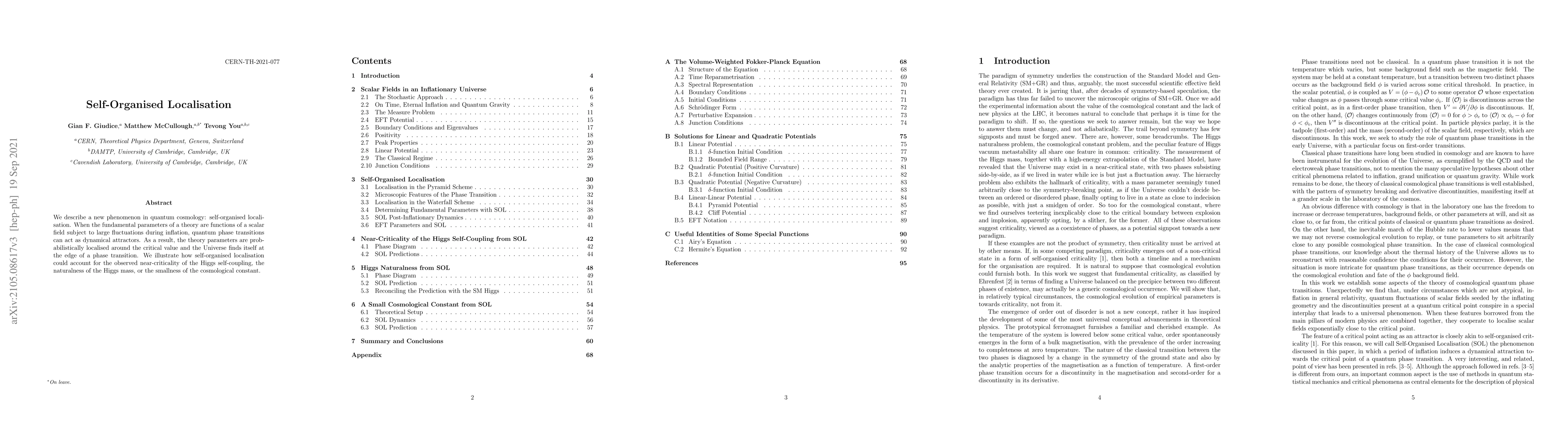 This paper introduces self-organised localisation in quantum cosmology, where quantum phase transitions act as attractors, probabilistically localising theory parameters around critical values, potentially explaining the near-criticality of the Higgs self-coupling and the smallness of the cosmological constant.