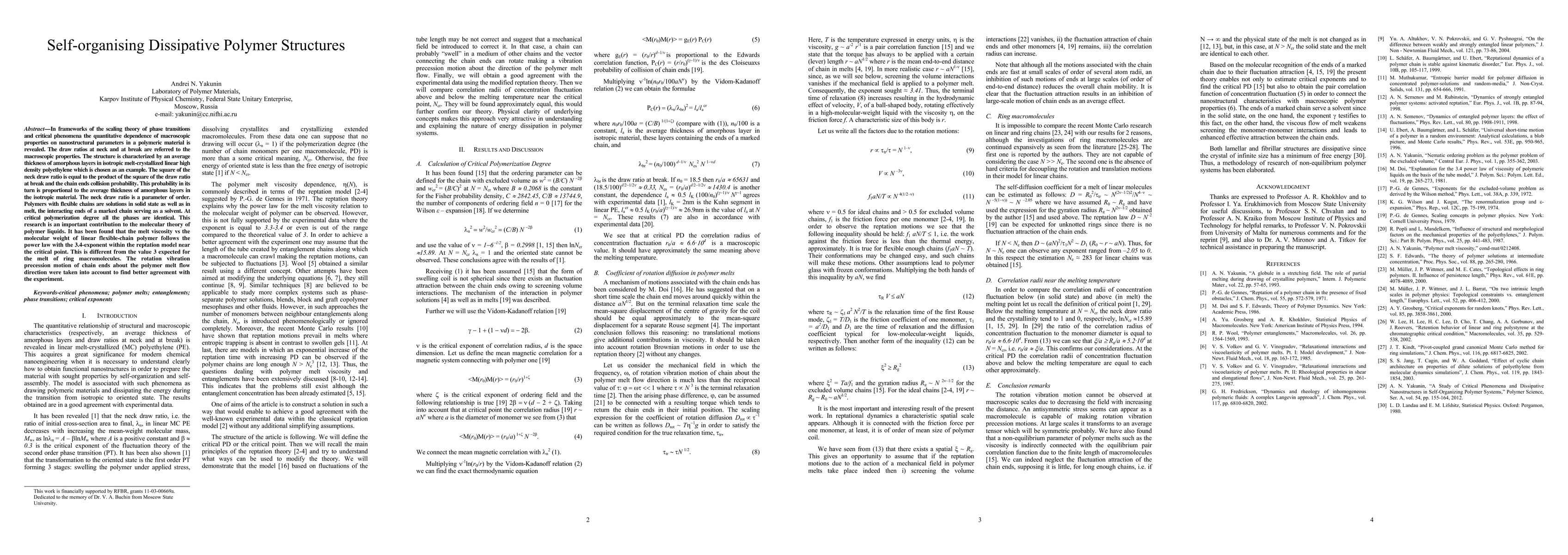 In frameworks of the scaling theory of phase transitions and critical phenomena the quantitative dependence of macroscopic properties on nanostructural parameters in a polymeric material is revealed. The draw ratios at neck and at break are referred to the macroscopic properties. The structure is characterized by an average thickness of amorphous layers in isotropic melt-crystallized linear high density polyethylene which is chosen as an example. The square of the neck draw ratio is equal to the product of the square of the draw ratio at break and the chain ends collision probability. This probability in its turn is proportional to the average thickness of amorphous layers in the isotropic material. The neck draw ratio is a parameter of order. Polymers with flexible chains are solutions in solid state as well as in melt, the interacting ends of a marked chain serving as a solvent. At critical polymerization degree all the phases are identical. This research is an important contribution to the molecular theory of polymer liquids. It has been found that the melt viscosity vs the molecular weight of linear flexible-chain polymer follows the power law with the 3.4-exponent within the reptation model near the critical point. This is different from the value 3 expected for the melt of ring macromolecules. The rotation vibration precession motion of chain ends about the polymer melt flow direction were taken into account to find better agreement with the experiment.