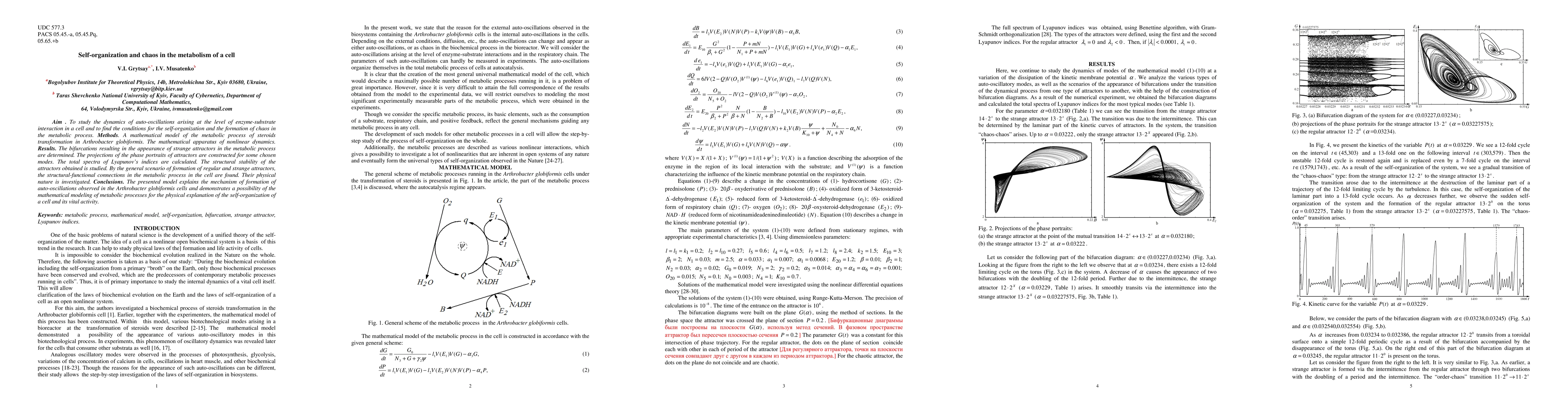 Aim. To study the dynamics of auto-oscillations arising at the level of enzyme-substrate interaction in a cell and to find the conditions for the self-organization and the formation of chaos in the metabolic process. Methods. A mathematical model of the metabolic process of steroids transformation in Arthrobacter globiformis. The mathematical apparatus of nonlinear dynamics. Results. The bifurcations resulting in the appearance of strange attractors in the metabolic process are determined. The projections of the phase portraits of attractors are constructed for some chosen modes. The total spectra of Lyapunov's indices are calculated. The structural stability of the attractors obtained is studied. By the general scenario of formation of regular and strange attractors, the structural-functional connections in the metabolic process in the cell are found. Their physical nature is investigated. Conclusions. The presented model explains the mechanism of formation of auto-oscillations observed in the A. globiformis cells and demonstrates a possibility of the mathematical modeling of metabolic processes for the physical explanation of the self-organization of a cell and its vital activity.
