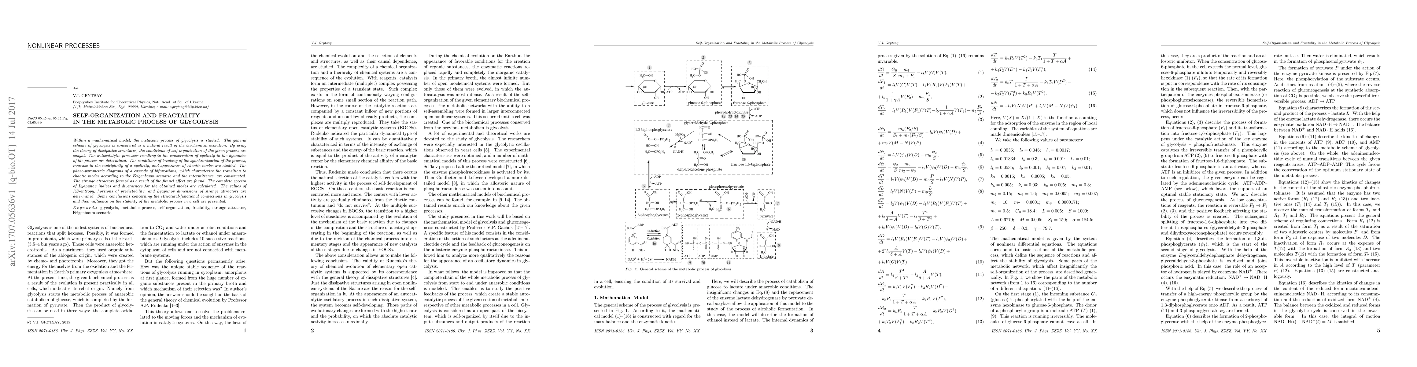This paper explores the self-organization and fractal dynamics in glycolysis using a mathematical model, revealing how autocatalytic processes maintain cyclicity and how bifurcations lead to chaotic modes, characterized by strange attractors and Lyapunov dimensions. It concludes with insights into the structural-functional relationships influencing metabolic stability.