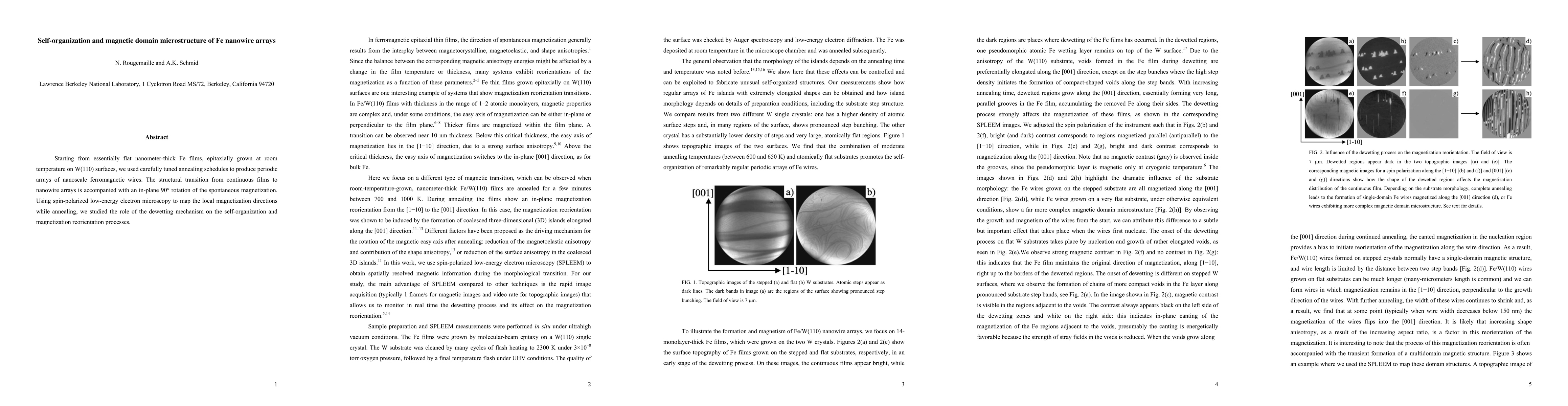 This study investigates the transformation of thin Fe films into periodic nanowire arrays via controlled annealing, revealing a 90-degree in-plane magnetization rotation. Spin-polarized microscopy elucidates the self-organization and magnetization dynamics driven by the dewetting mechanism.