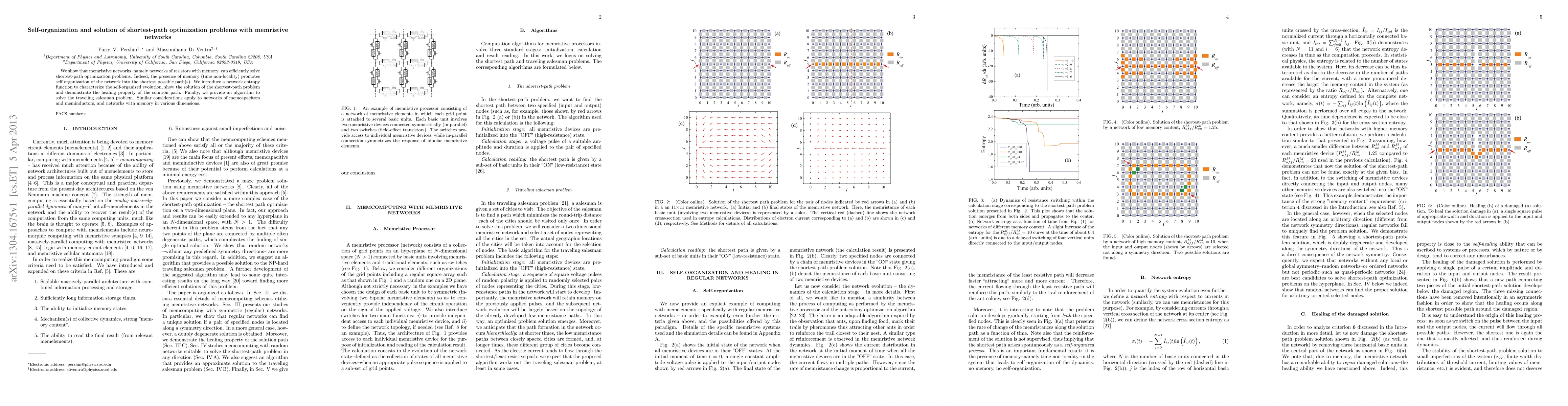 Memristive networks, which are memory-based resistor networks, can efficiently solve shortest-path optimization problems through self-organization due to their memory properties. The study introduces a network entropy function and demonstrates the network's ability to heal and solve the traveling salesman problem, extending to other memory-based components and higher dimensions.