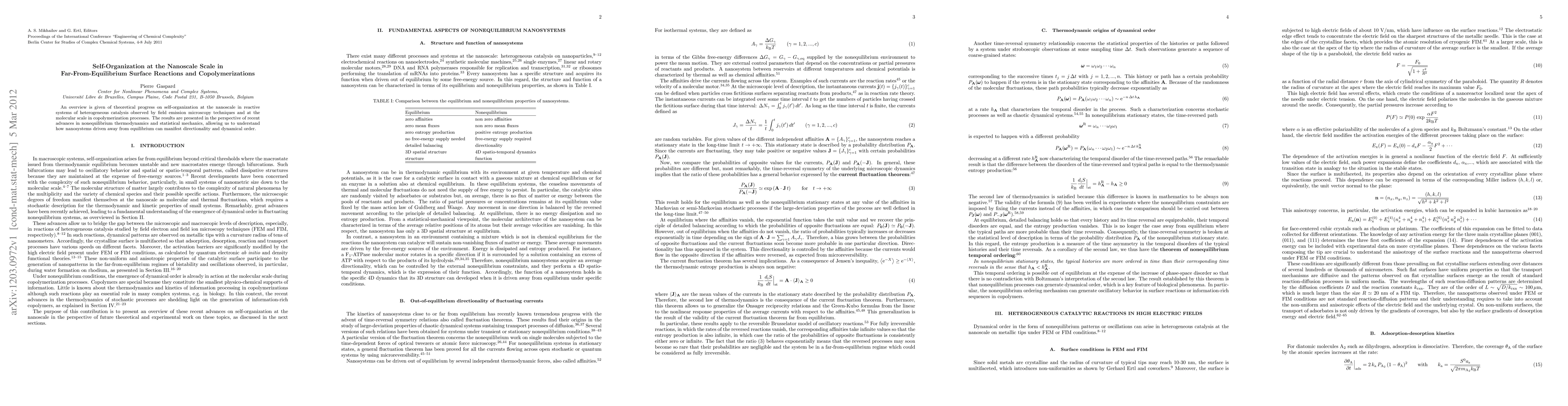 An overview is given of theoretical progress on self-organization at the nanoscale in reactive systems of heterogeneous catalysis observed by field emission microscopy techniques and at the molecular scale in copolymerization processes. The results are presented in the perspective of recent advances in nonequilibrium thermodynamics and statistical mechanics, allowing us to understand how nanosystems driven away from equilibrium can manifest directionality and dynamical order.