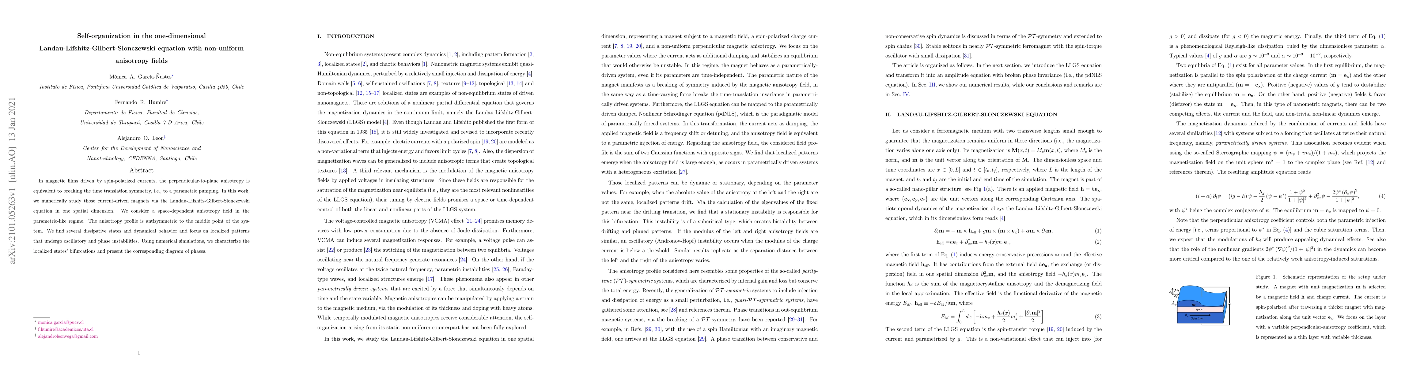 In magnetic films driven by spin-polarized currents, the perpendicular-to-plane anisotropy is equivalent to breaking the time translation symmetry, i.e., to a parametric pumping. In this work, we numerically study those current-driven magnets via the Landau-Lifshitz-Gilbert-Slonczewski equation in one spatial dimension. We consider a space-dependent anisotropy field in the parametric-like regime. The anisotropy profile is antisymmetric to the middle point of the system. We find several dissipative states and dynamical behavior and focus on localized patterns that undergo oscillatory and phase instabilities. Using numerical simulations, we characterize the localized states' bifurcations and present the corresponding diagram of phases.