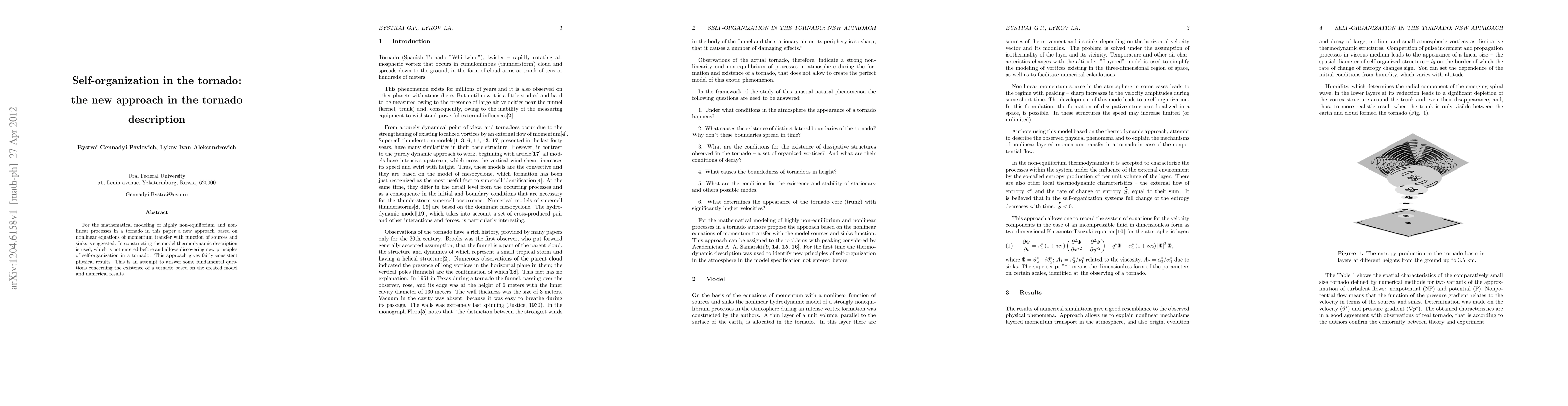 For the mathematical modeling of highly non-equilibrium and nonlinear processes in a tornado in this paper a new approach based on nonlinear equations of momentum transfer with function of sources and sinks is suggested. In constructing the model thermodynamic description is used, which is not entered before and allows discovering new principles of self-organization in a tornado. This approach gives fairly consistent physical results. This is an attempt to answer some fundamental questions concerning the existence of a tornado based on the created model and numerical results.