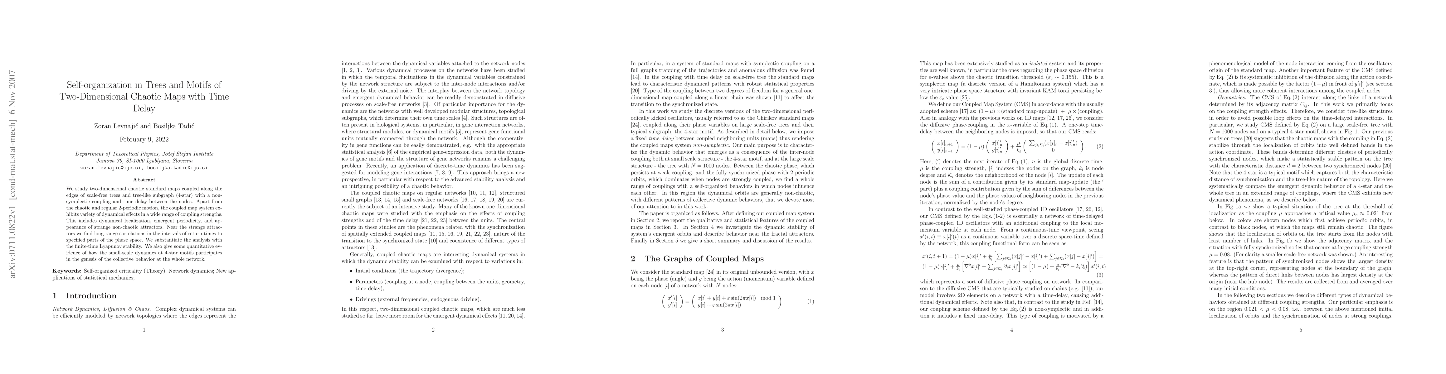 We study two-dimensional chaotic standard maps coupled along the edges of scale-free trees and tree-like subgraph (4-star) with a non-symplectic coupling and time delay between the nodes. Apart from the chaotic and regular 2-periodic motion, the coupled map system exhibits variety of dynamical effects in a wide range of coupling strengths. This includes dynamical localization, emergent periodicity, and appearance of strange non-chaotic attractors. Near the strange attractors we find long-range correlations in the intervals of return-times to specified parts of the phase space. We substantiate the analysis with the finite-time Lyapunov stability. We also give some quantitative evidence of how the small-scale dynamics at 4-star motifs participates in the genesis of the collective behavior at the whole network.