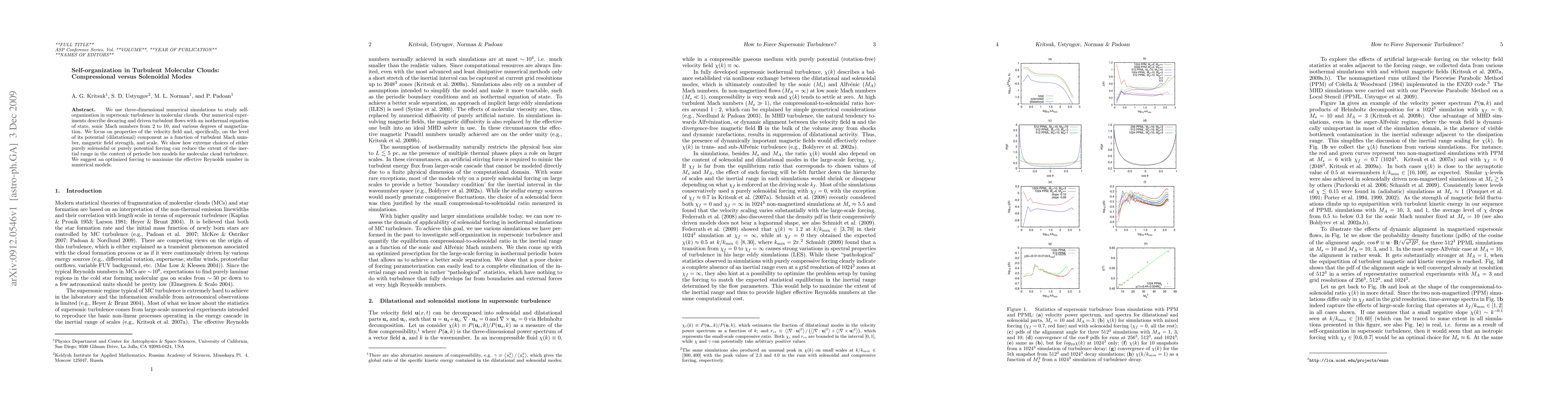 We use three-dimensional numerical simulations to study self-organization in supersonic turbulence in molecular clouds. Our numerical experiments describe decaying and driven turbulent flows with an isothermal equation of state, sonic Mach numbers from 2 to 10, and various degrees of magnetization. We focus on properties of the velocity field and, specifically, on the level of its potential (dilatational) component as a function of turbulent Mach number, magnetic field strength, and scale. We show how extreme choices of either purely solenoidal or purely potential forcing can reduce the extent of the inertial range in the context of periodic box models for molecular cloud turbulence. We suggest an optimized forcing to maximize the effective Reynolds number in numerical models.