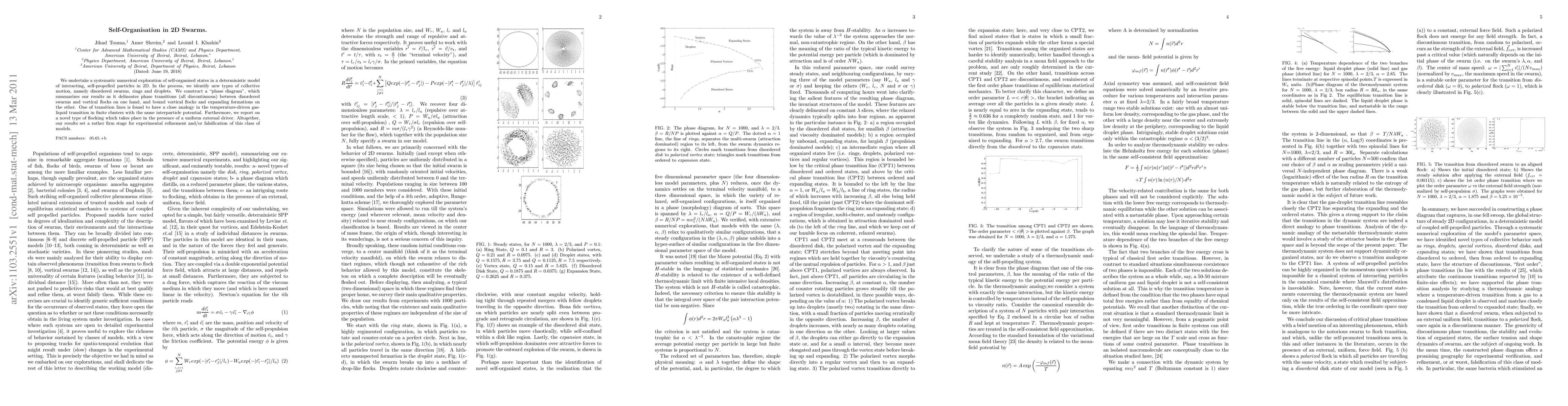 The study systematically investigates self-organization in two-dimensional swarms using a deterministic model, identifying collective motions like disordered swarms, rings, and droplets, and constructs a phase diagram detailing phase transitions between various flock states, including a transition analogous to gas-liquid transitions. It also reports flocking behavior under an external driver.