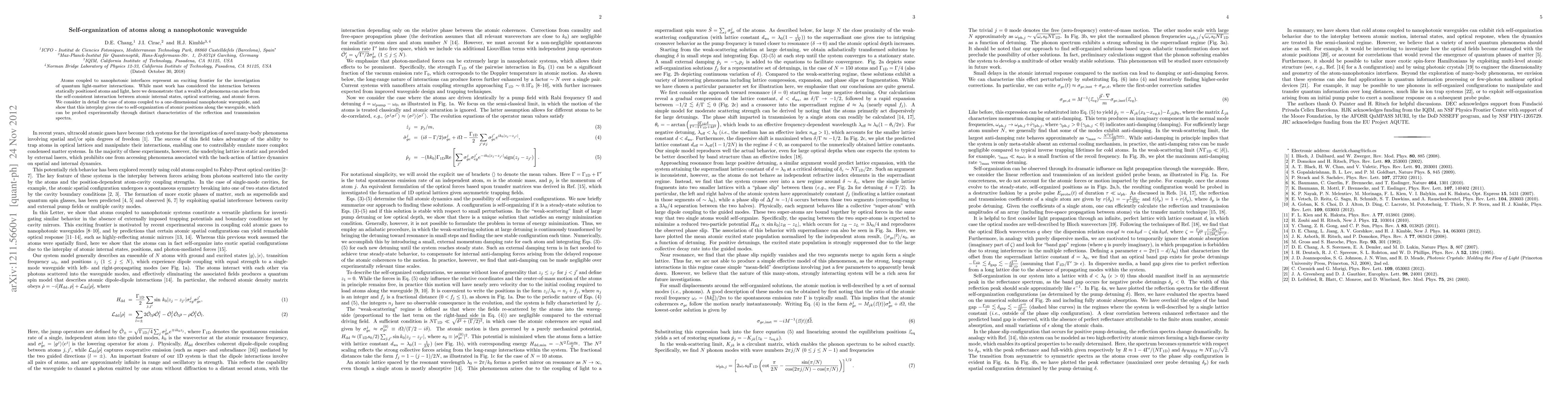 This paper investigates quantum light-matter interactions by demonstrating self-organization of atoms along a nanophotonic waveguide due to the interplay of atomic states, optical scattering, and atomic forces, which can be observed through unique reflection and transmission spectra.