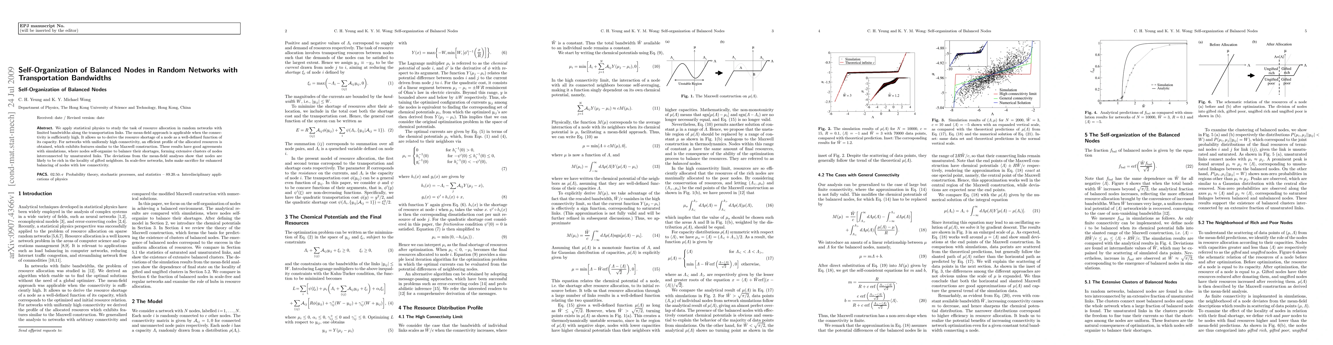 This paper uses statistical physics to analyze resource allocation in random networks with limited bandwidths, showing that nodes self-organize to balance resource shortages, forming clusters of interconnected nodes. The mean-field approach reveals efficient resource allocation profiles, with deviations indicating hubs' sacrifices in scale-free networks for better balancing.