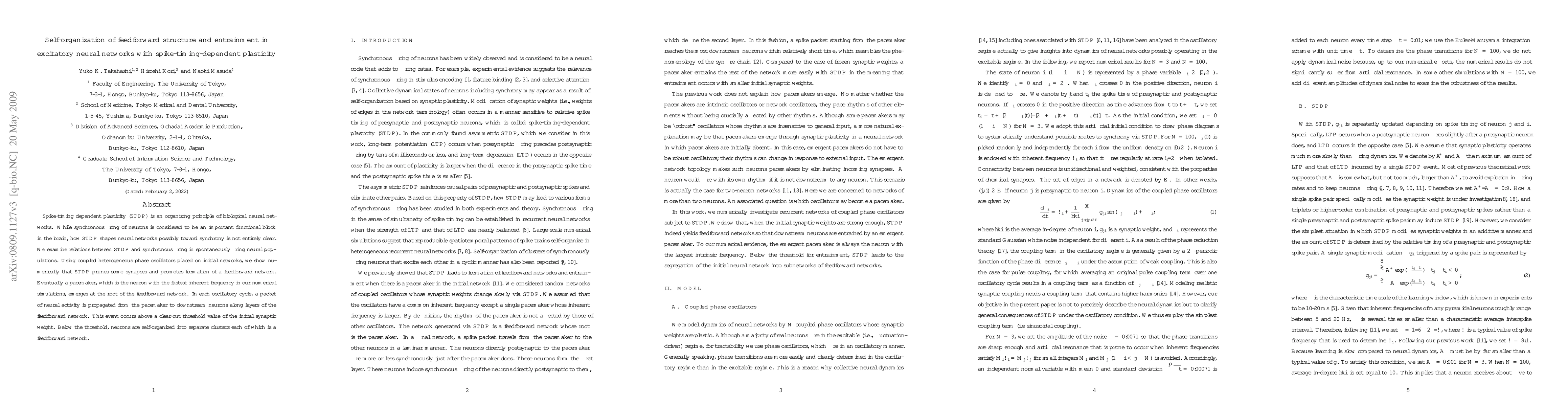 Spike-timing dependent plasticity (STDP) is an organizing principle of biological neural networks. While synchronous firing of neurons is considered to be an important functional block in the brain, how STDP shapes neural networks possibly toward synchrony is not entirely clear. We examine relations between STDP and synchronous firing in spontaneously firing neural populations. Using coupled heterogeneous phase oscillators placed on initial networks, we show numerically that STDP prunes some synapses and promotes formation of a feedforward network. Eventually a pacemaker, which is the neuron with the fastest inherent frequency in our numerical simulations, emerges at the root of the feedforward network. In each oscillatory cycle, a packet of neural activity is propagated from the pacemaker to downstream neurons along layers of the feedforward network. This event occurs above a clear-cut threshold value of the initial synaptic weight. Below the threshold, neurons are self-organized into separate clusters each of which is a feedforward network.