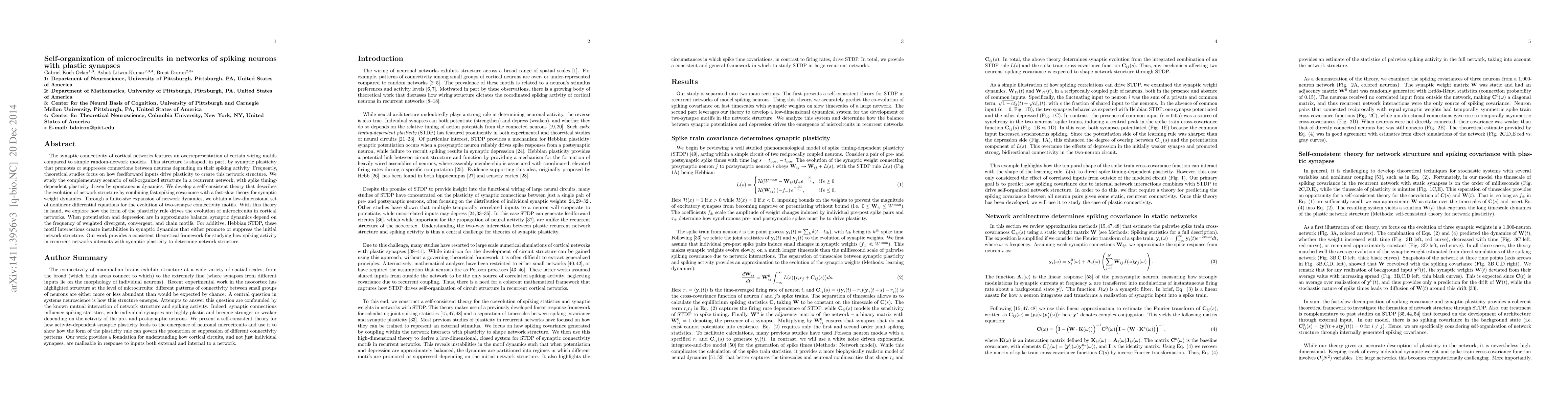 The synaptic connectivity of cortical networks features an overrepresentation of certain wiring motifs compared to simple random-network models. This structure is shaped, in part, by synaptic plasticity that promotes or suppresses connections between neurons depending on their spiking activity. Frequently, theoretical studies focus on how feedforward inputs drive plasticity to create this network structure. We study the complementary scenario of self-organized structure in a recurrent network, with spike timing-dependent plasticity driven by spontaneous dynamics. We develop a self-consistent theory that describes the evolution of network structure by combining fast spiking covariance with a fast-slow theory for synaptic weight dynamics. Through a finite-size expansion of network dynamics, we obtain a low-dimensional set of nonlinear differential equations for the evolution of two-synapse connectivity motifs. With this theory in hand, we explore how the form of the plasticity rule drives the evolution of microcircuits in cortical networks. When potentiation and depression are in approximate balance, synaptic dynamics depend on the frequency of weighted divergent, convergent, and chain motifs. For additive, Hebbian STDP, these motif interactions create instabilities in synaptic dynamics that either promote or suppress the initial network structure. Our work provides a consistent theoretical framework for studying how spiking activity in recurrent networks interacts with synaptic plasticity to determine network structure.