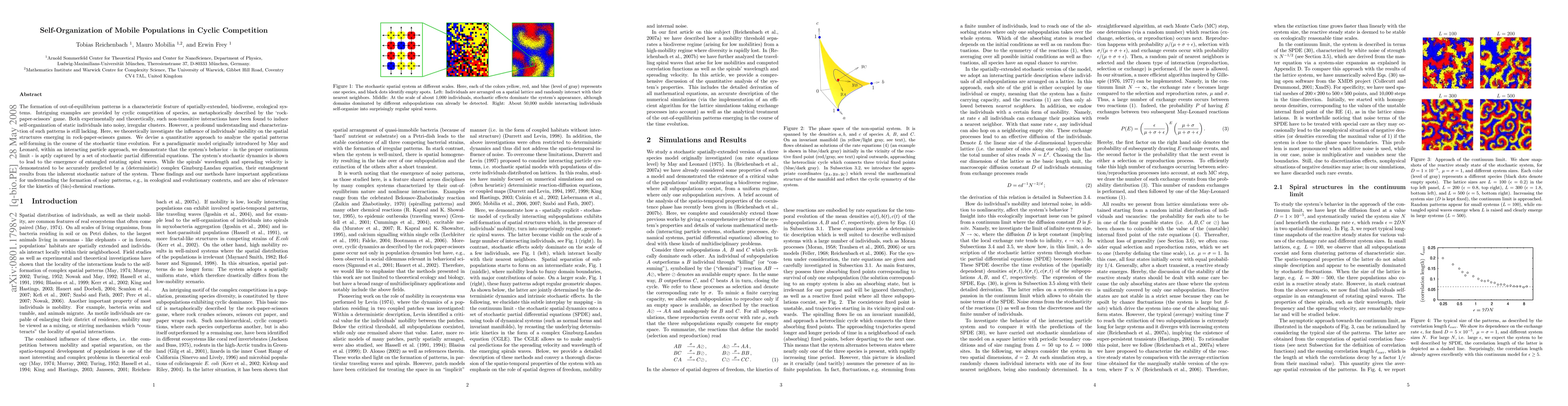 The formation of out-of-equilibrium patterns is a characteristic feature of spatially-extended, biodiverse, ecological systems. Intriguing examples are provided by cyclic competition of species, as metaphorically described by the `rock-paper-scissors' game. Both experimentally and theoretically, such non-transitive interactions have been found to induce self-organization of static individuals into noisy, irregular clusters. However, a profound understanding and characterization of such patterns is still lacking. Here, we theoretically investigate the influence of individuals' mobility on the spatial structures emerging in rock-paper-scissors games. We devise a quantitative approach to analyze the spatial patterns self-forming in the course of the stochastic time evolution. For a paradigmatic model originally introduced by May and Leonard, within an interacting particle approach, we demonstrate that the system's behavior - in the proper continuum limit - is aptly captured by a set of stochastic partial differential equations. The system's stochastic dynamics is shown to lead to the emergence of entangled rotating spiral waves. While the spirals' wavelength and spreading velocity is demonstrated to be accurately predicted by a (deterministic) complex Ginzburg-Landau equation, their entanglement results from the inherent stochastic nature of the system.These findings and our methods have important applications for understanding the formation of noisy patterns, e.g., in ecological and evolutionary contexts, and are also of relevance for the kinetics of (bio)-chemical reactions.