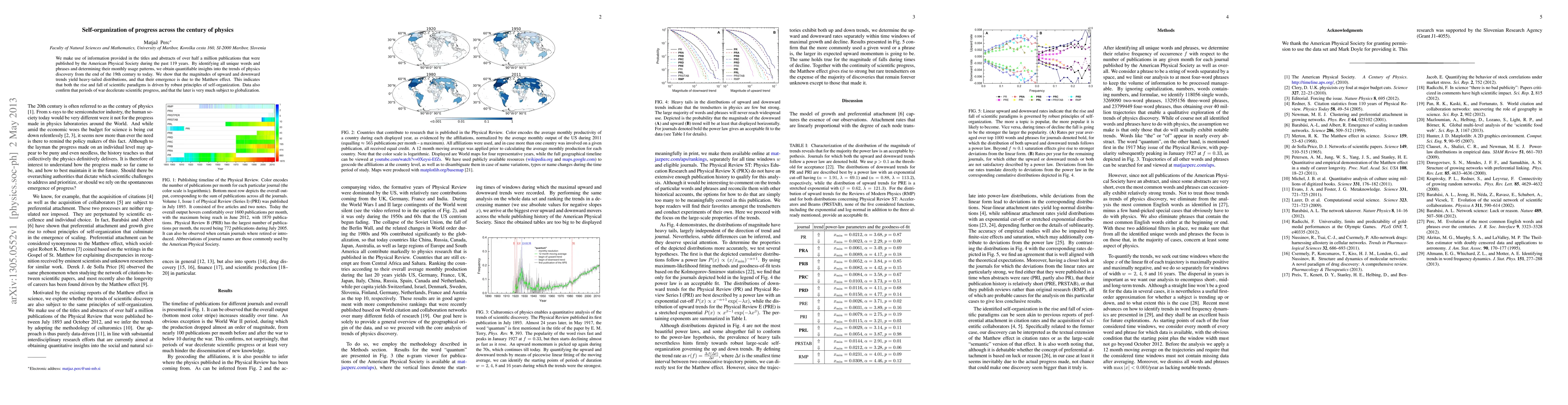 We make use of information provided in the titles and abstracts of over half a million publications that were published by the American Physical Society during the past 119 years. By identifying all unique words and phrases and determining their monthly usage patterns, we obtain quantifiable insights into the trends of physics discovery from the end of the 19th century to today. We show that the magnitudes of upward and downward trends yield heavy-tailed distributions, and that their emergence is due to the Matthew effect. This indicates that both the rise and fall of scientific paradigms is driven by robust principles of self-organization. Data also confirm that periods of war decelerate scientific progress, and that the later is very much subject to globalization.