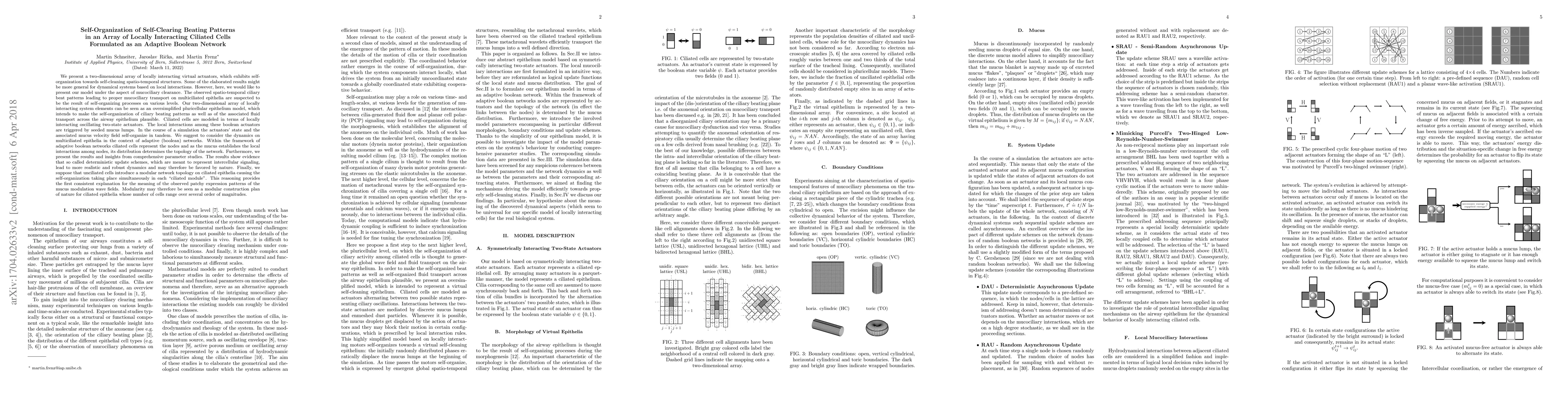 The observed spatio-temporal ciliary beat patterns on multiciliated epithelia are suspected to be the result of self-organizing processes on various levels. Here, we present an abstract epithelium model at the pluricellular level, which intends to make the self-organization of ciliary beating patterns as well as of the associated fluid transport across the airway epithelium plausible. Ciliated cells are modeled in terms of locally interacting oscillating two-state actuators. The local interactions among these boolean actuators are triggered by seeded mucus lumps. In the course of a simulation the actuators' state and the associated mucus velocity field self-organize in tandem. We suggest to consider the dynamics on multiciliated epithelia in the context of adaptive (boolean) networks. Within the framework of adaptive boolean networks ciliated cells represent the nodes and as the mucus establishes the local interactions among nodes, its distribution determines the topology of the network. Furthermore, we present the results and insights from comprehensive parameter studies. The results show evidence that so called deterministic update schemes, which are meant to represent intercellular signaling, lead to more realistic and robust dynamics and may therefore be favored by nature. Finally, we suppose that unciliated cells introduce a modular network topology on ciliated epithelia causing the self-organization taking place simultaneously in each "ciliated module". This reasoning provides the first consistent explanation for the meaning of the observed patchy expression patterns of the mucus modulation wave fields. Modularity may therefore be seen as a modular construction plan of nature for ciliated epithelia whose number of cells range over several order of magnitudes.
