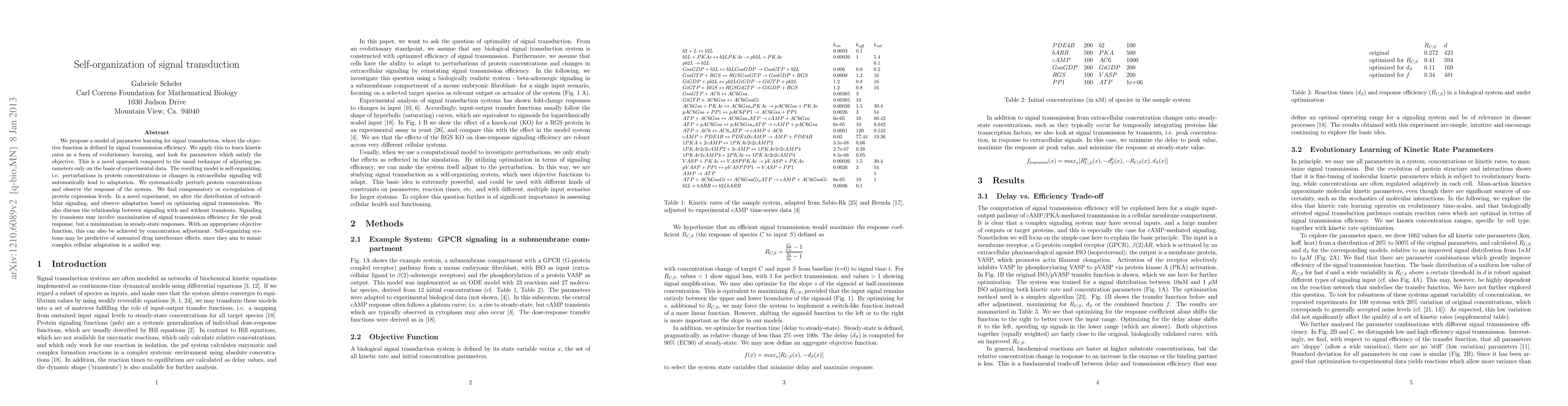 This research proposes a self-organizing model for signal transduction that optimizes signal transmission efficiency through evolutionary learning of kinetic rates, demonstrating adaptive responses to perturbations and highlighting the potential for predicting drug interference effects. The model shows compensatory regulation of protein expression and adaptability to changes in extracellular signaling.