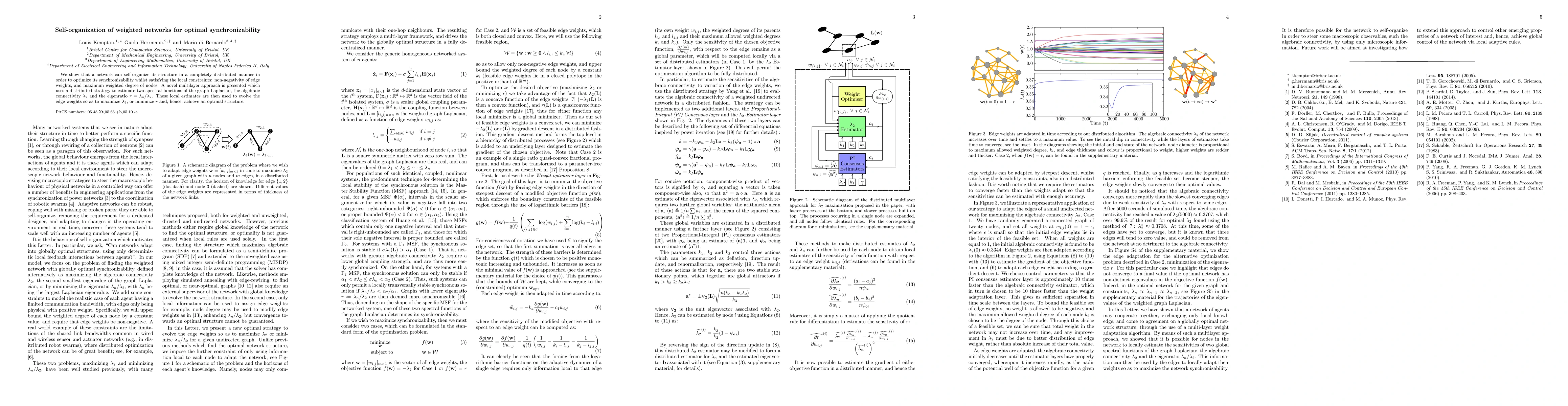 Researchers developed a method for self-organizing networks to optimize synchronizability while following local constraints. They created a multilayer approach using distributed estimates of graph Laplacian functions to evolve edge weights.