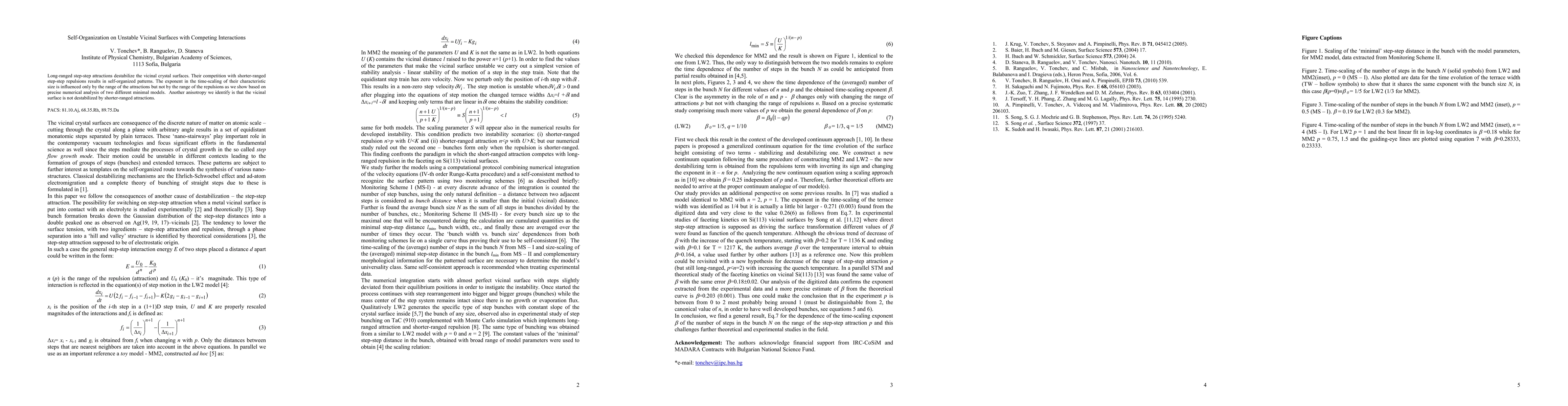 This paper explores self-organization on unstable vicinal surfaces driven by competing long-ranged attractions and short-ranged repulsions, revealing that the time-scaling exponent for pattern size is determined by the range of attractions alone. It also finds that shorter-ranged attractions do not destabilize the surface.