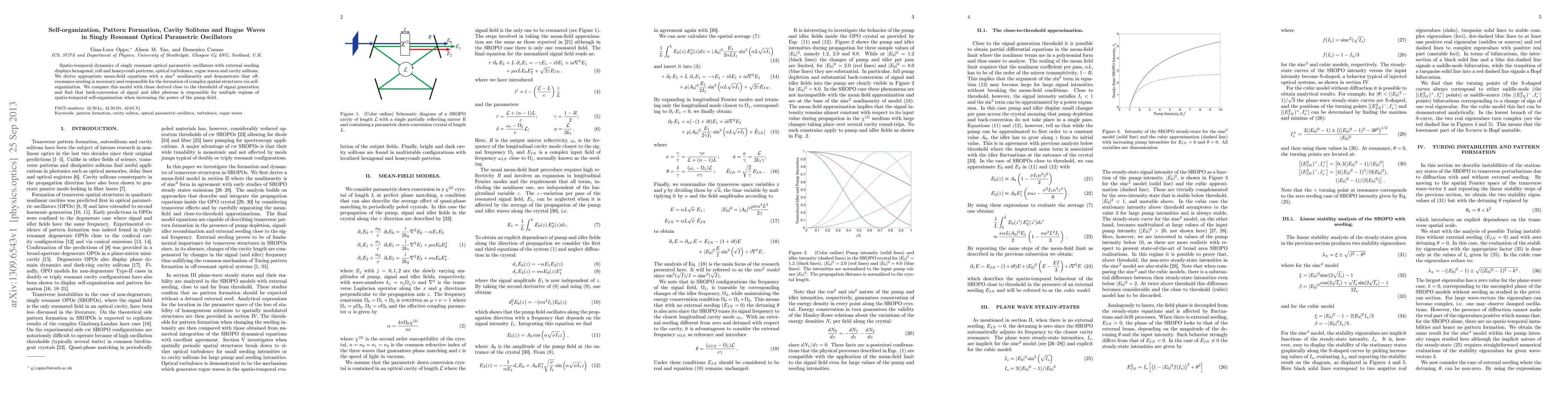 This paper investigates the complex dynamics in singly resonant optical parametric oscillators, revealing hexagonal, roll, and honeycomb patterns, optical turbulence, rogue waves, and cavity solitons through self-organization. It derives mean-field equations with sinc$^2$ nonlinearity, showing that off-resonance seeding is essential for the formation of these structures.