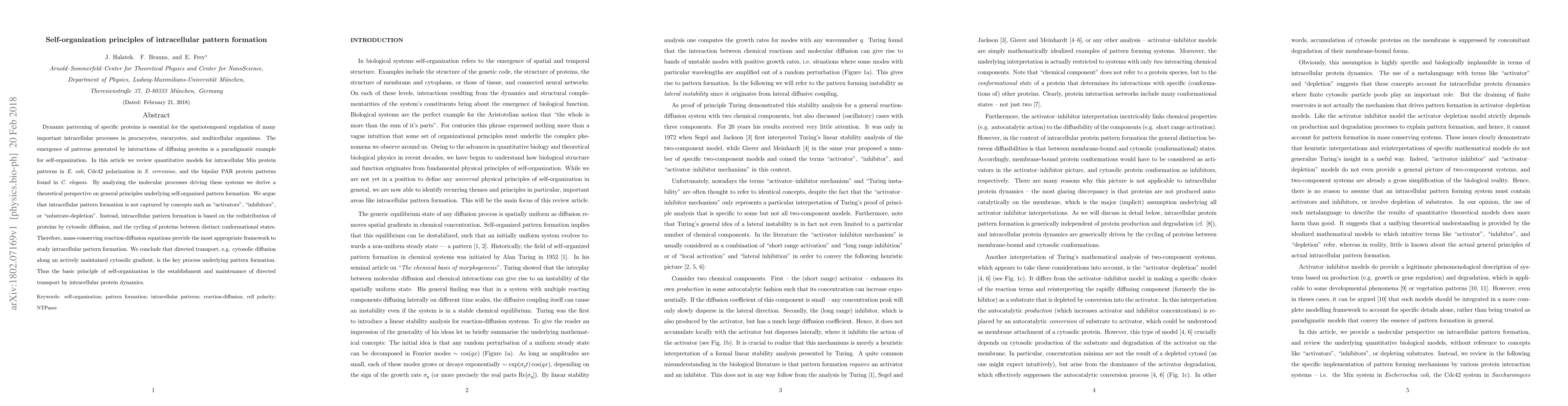 Dynamic patterning of specific proteins is essential for the spatiotemporal regulation of many important intracellular processes in procaryotes, eucaryotes, and multicellular organisms. The emergence of patterns generated by interactions of diffusing proteins is a paradigmatic example for self-organization. In this article we review quantitative models for intracellular Min protein patterns in E. coli, Cdc42 polarization in S. cerevisiae, and the bipolar PAR protein patterns found in C. elegans. By analyzing the molecular processes driving these systems we derive a theoretical perspective on general principles underlying self-organized pattern formation. We argue that intracellular pattern formation is not captured by concepts such as "activators"', "inhibitors", or "substrate-depletion". Instead, intracellular pattern formation is based on the redistribution of proteins by cytosolic diffusion, and the cycling of proteins between distinct conformational states. Therefore, mass-conserving reaction-diffusion equations provide the most appropriate framework to study intracellular pattern formation. We conclude that directed transport, e.g. cytosolic diffusion along an actively maintained cytosolic gradient, is the key process underlying pattern formation. Thus the basic principle of self-organization is the establishment and maintenance of directed transport by intracellular protein dynamics.