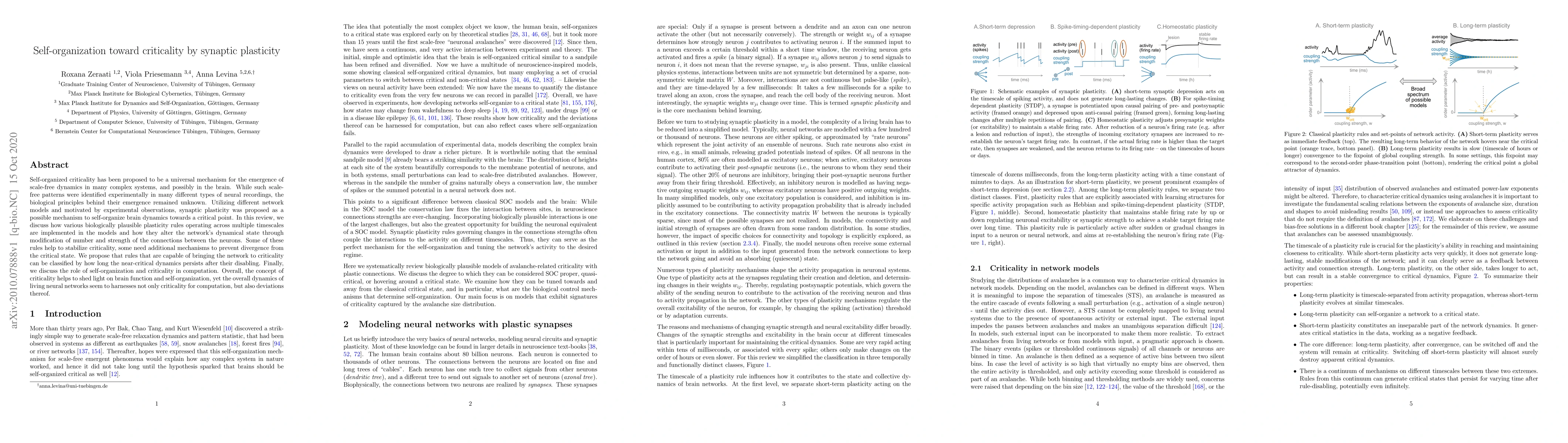 Self-organized criticality has been proposed to be a universal mechanism for the emergence of scale-free dynamics in many complex systems, and possibly in the brain. While such scale-free patterns were identified experimentally in many different types of neural recordings, the biological principles behind their emergence remained unknown. Utilizing different network models and motivated by experimental observations, synaptic plasticity was proposed as a possible mechanism to self-organize brain dynamics towards a critical point. In this review, we discuss how various biologically plausible plasticity rules operating across multiple timescales are implemented in the models and how they alter the network's dynamical state through modification of number and strength of the connections between the neurons. Some of these rules help to stabilize criticality, some need additional mechanisms to prevent divergence from the critical state. We propose that rules that are capable of bringing the network to criticality can be classified by how long the near-critical dynamics persists after their disabling. Finally, we discuss the role of self-organization and criticality in computation. Overall, the concept of criticality helps to shed light on brain function and self-organization, yet the overall dynamics of living neural networks seem to harnesses not only criticality for computation, but also deviations thereof.
