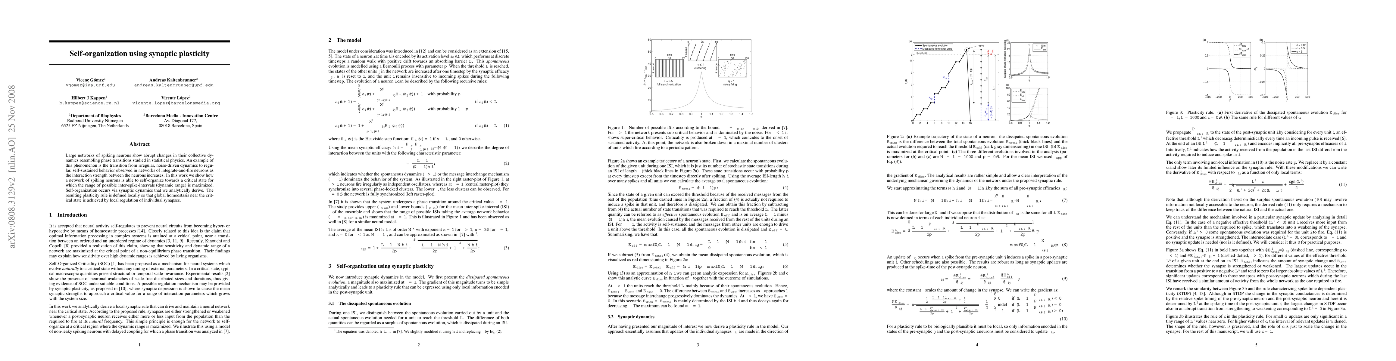 This paper explores how networks of spiking neurons self-organize via synaptic plasticity to reach a critical state maximizing the dynamic range of inter-spike intervals. The self-organization is achieved through locally regulated synaptic dynamics that maintain global homeostasis.