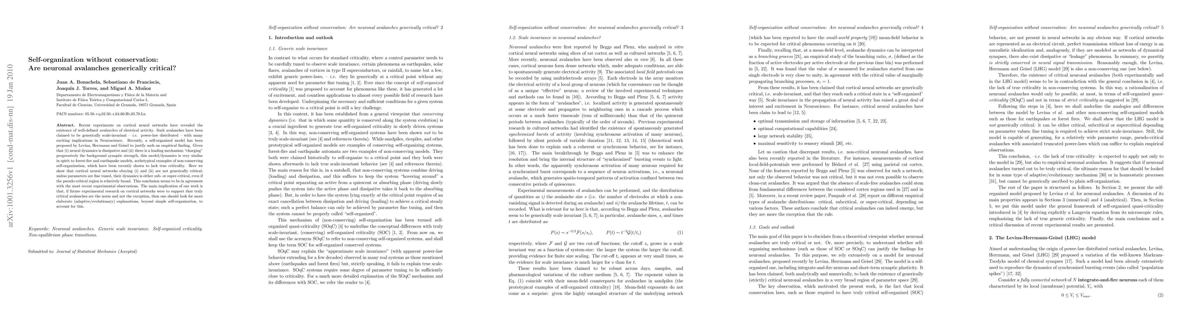 Recent experiments on cortical neural networks have revealed the existence of well-defined avalanches of electrical activity. Such avalanches have been claimed to be generically scale-invariant -- i.e. power-law distributed -- with many exciting implications in Neuroscience. Recently, a self-organized model has been proposed by Levina, Herrmann and Geisel to justify such an empirical finding. Given that (i) neural dynamics is dissipative and (ii) there is a loading mechanism "charging" progressively the background synaptic strength, this model/dynamics is very similar in spirit to forest-fire and earthquake models, archetypical examples of non-conserving self-organization, which have been recently shown to lack true criticality. Here we show that cortical neural networks obeying (i) and (ii) are not generically critical; unless parameters are fine tuned, their dynamics is either sub- or super-critical, even if the pseudo-critical region is relatively broad. This conclusion seems to be in agreement with the most recent experimental observations. The main implication of our work is that, if future experimental research on cortical networks were to support that truly critical avalanches are the norm and not the exception, then one should look for more elaborate (adaptive/evolutionary) explanations, beyond simple self-organization, to account for this.