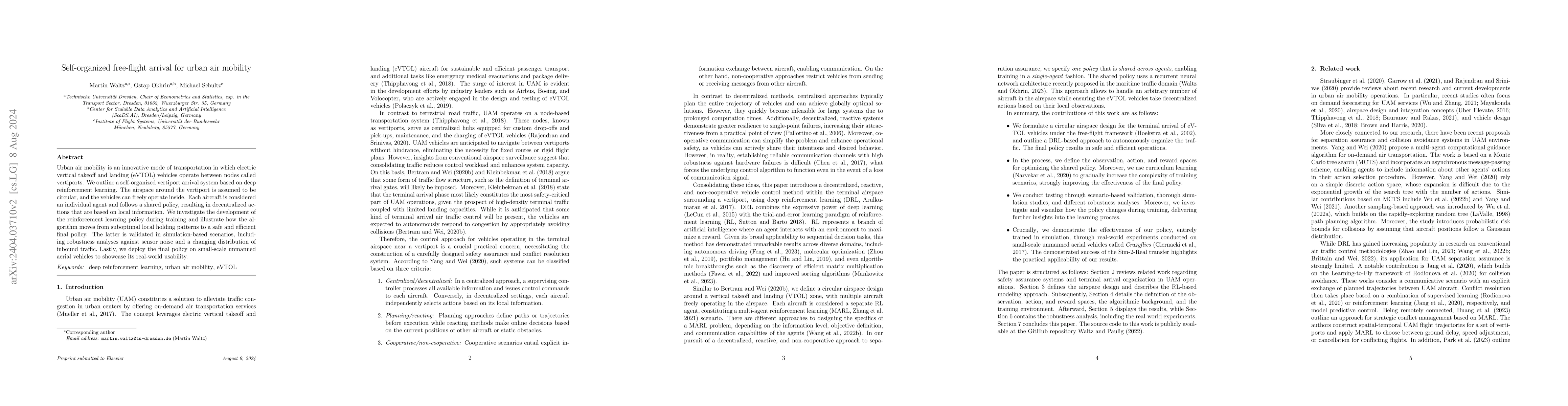 This research proposes a self-organized arrival system for urban air mobility using deep reinforcement learning to optimize the operation of eVTOL vehicles at vertiports. The system trains an algorithm that evolves from local holding patterns to a safe and efficient policy, validated both in simulations and on small UAVs.