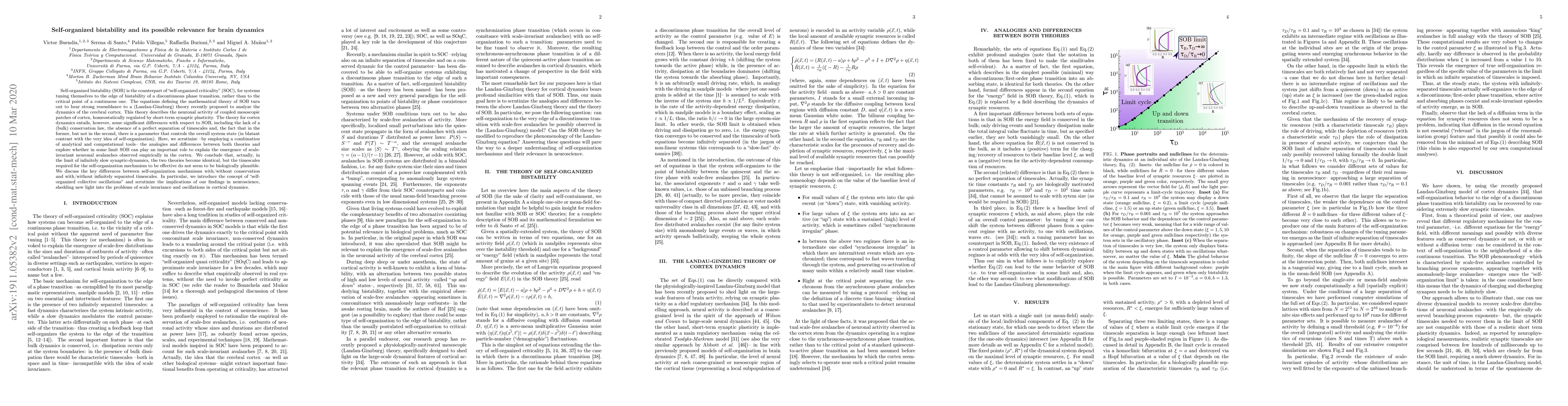 Self-organized bistability (SOB) is the counterpart of 'self-organized criticality' (SOC), for systems tuning themselves to the edge of bistability of a discontinuous phase transition, rather than to the critical point of a continuous one. The equations defining the mathematical theory of SOB turn out to bear strong resemblance to a (Landau-Ginzburg) theory recently proposed to analyze the dynamics of the cerebral cortex. This theory describes the neuronal activity of coupled mesoscopic patches of cortex, homeostatically regulated by short-term synaptic plasticity. The theory for cortex dynamics entails, however, some significant differences with respect to SOB, including the lack of a (bulk) conservation law, the absence of a perfect separation of timescales and, the fact that in the former, but not in the second, there is a parameter that controls the overall system state (in blatant contrast with the very idea of self-organization). Here, we scrutinize --by employing a combination of analytical and computational tools-- the analogies and differences between both theories and explore whether in some limit SOB can play an important role to explain the emergence of scale-invariant neuronal avalanches observed empirically in the cortex. We conclude that, actually, in the limit of infinitely slow synaptic-dynamics, the two theories become identical, but the timescales required for the self-organization mechanism to be effective do not seem to be biologically plausible. We discuss the key differences between self-organization mechanisms with/without conservation and with/without infinitely separated timescales. In particular, we introduce the concept of 'self-organized collective oscillations' and scrutinize the implications of our findings in neuroscience, shedding new light into the problems of scale invariance and oscillations in cortical dynamics.