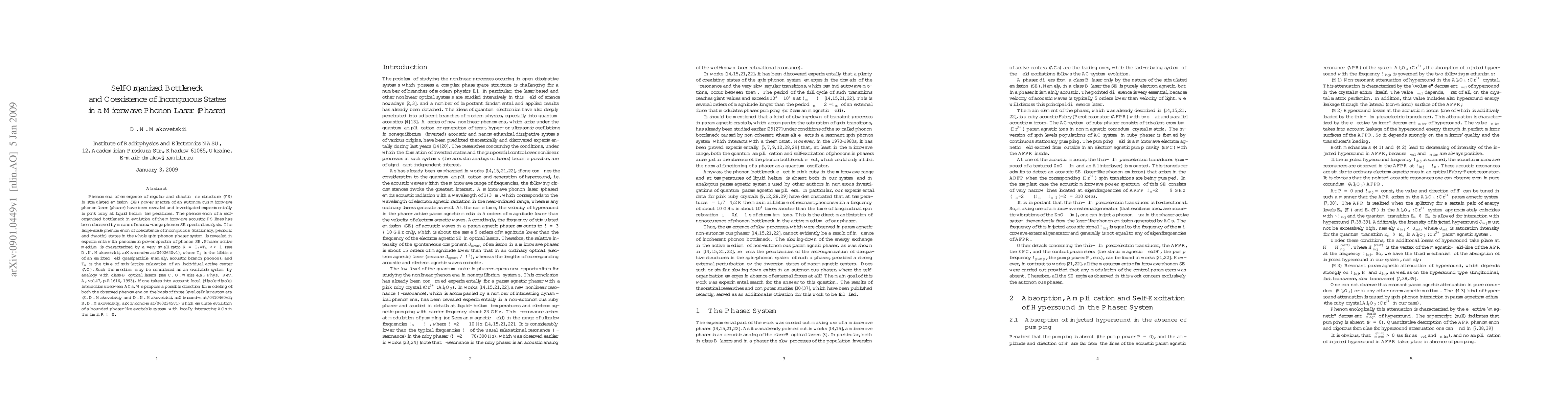 This paper investigates the emergence of regular and chaotic fine structures in a microwave phonon laser (phaser) using pink ruby at low temperatures, revealing a self-organized bottleneck in the evolution of acoustic lines and the coexistence of various states. The authors propose a cellular automata model to simulate these phenomena.