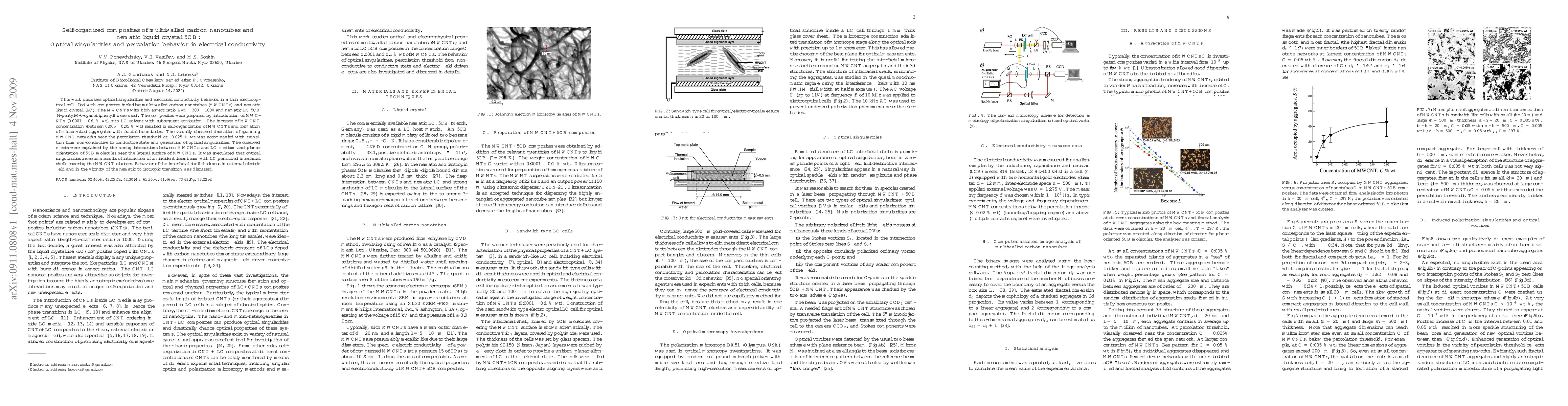 Researchers created composites of multi-walled carbon nanotubes and nematic liquid crystal 5CB, observing optical singularities and changes in electrical conductivity near percolation thresholds.