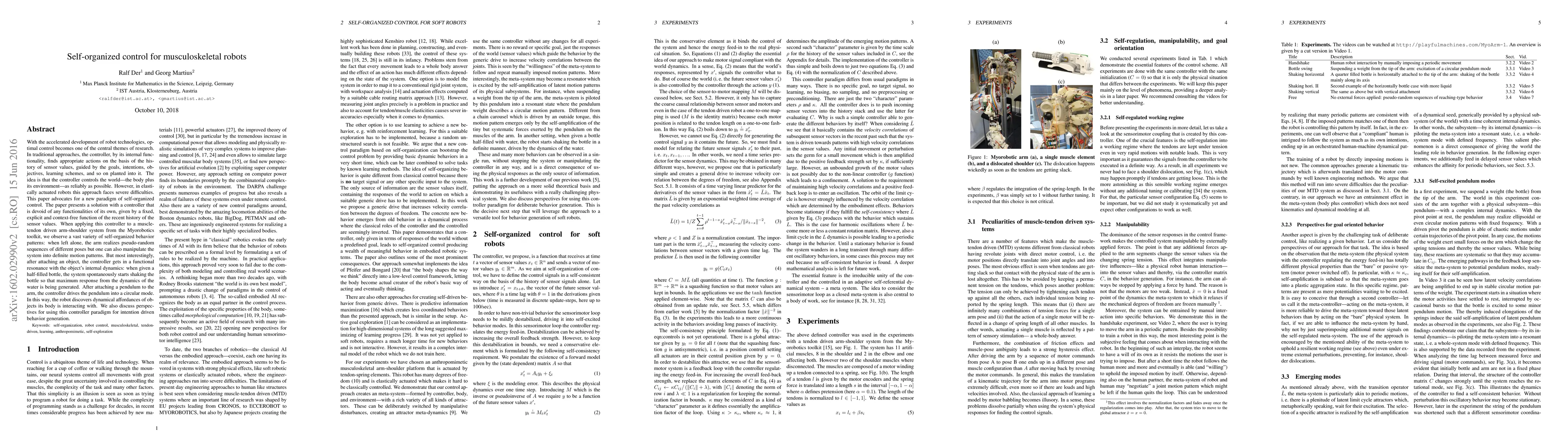 With the accelerated development of robot technologies, optimal control becomes one of the central themes of research. In traditional approaches, the controller, by its internal functionality, finds appropriate actions on the basis of the history of sensor values, guided by the goals, intentions, objectives, learning schemes, and so on planted into it. The idea is that the controller controls the world---the body plus its environment---as reliably as possible. However, in elastically actuated robots this approach faces severe difficulties. This paper advocates for a new paradigm of self-organized control. The paper presents a solution with a controller that is devoid of any functionalities of its own, given by a fixed, explicit and context-free function of the recent history of the sensor values. When applying this controller to a muscle-tendon driven arm-shoulder system from the Myorobotics toolkit, we observe a vast variety of self-organized behavior patterns: when left alone, the arm realizes pseudo-random sequences of different poses but one can also manipulate the system into definite motion patterns. But most interestingly, after attaching an object, the controller gets in a functional resonance with the object's internal dynamics: when given a half-filled bottle, the system spontaneously starts shaking the bottle so that maximum response from the dynamics of the water is being generated. After attaching a pendulum to the arm, the controller drives the pendulum into a circular mode. In this way, the robot discovers dynamical affordances of objects its body is interacting with. We also discuss perspectives for using this controller paradigm for intention driven behavior generation.
