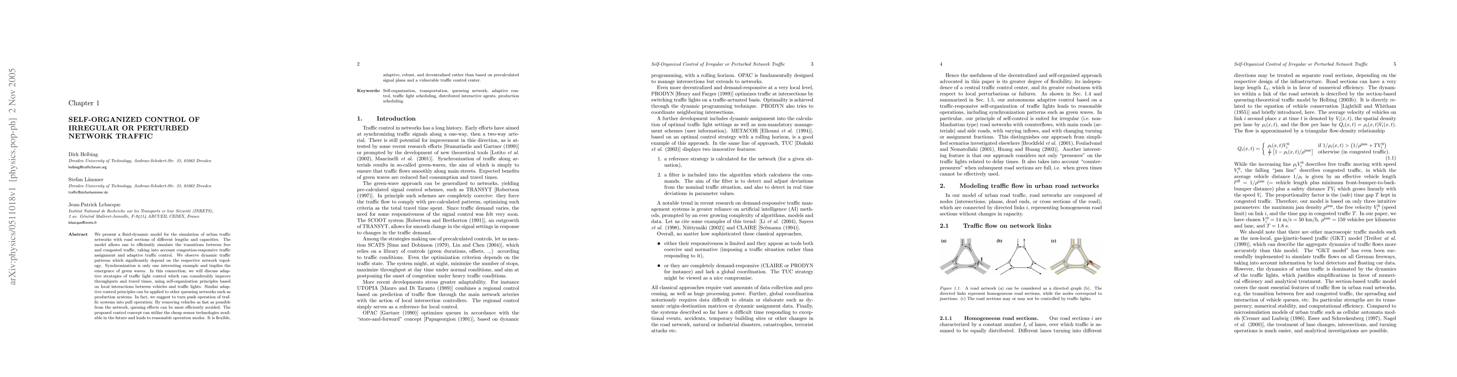 This paper introduces a fluid-dynamic model for simulating urban traffic networks, focusing on self-organized control to manage irregular traffic flows. The model emphasizes adaptive traffic light strategies that enhance throughput and reduce travel times by leveraging local interactions and avoiding precalculated plans.