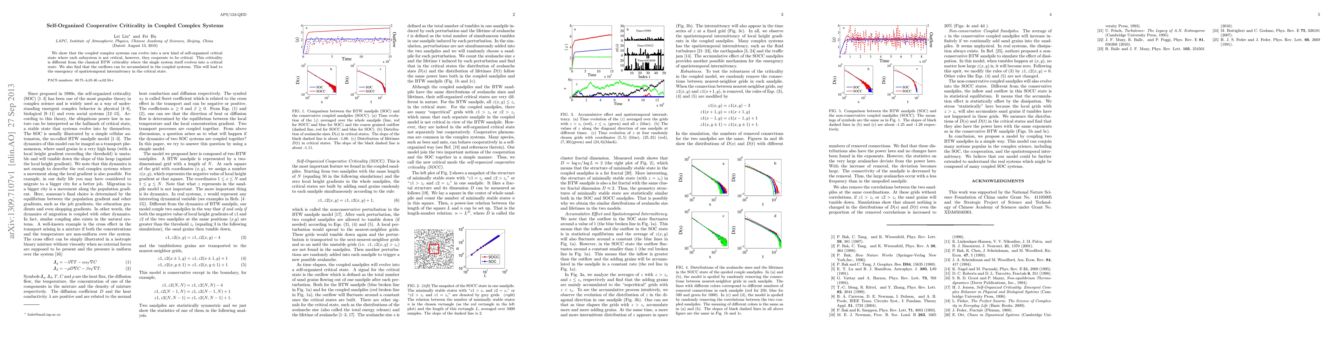 The research demonstrates that coupled complex systems can achieve a novel self-organized critical state where individual subsystems remain non-critical but collaboratively reach a critical state, differing from classical BTW criticality. This cooperative criticality results in spatiotemporal intermittency due to accumulated outflows within the coupled systems.