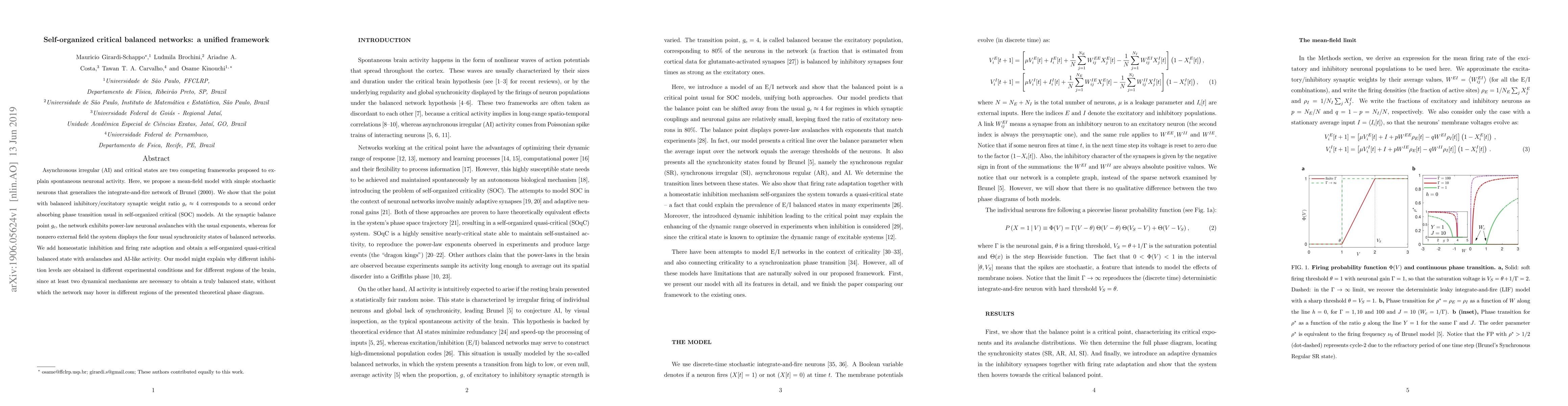 Asynchronous irregular (AI) and critical states are two competing frameworks proposed to explain spontaneous neuronal activity. Here, we propose a mean-field model with simple stochastic neurons that generalizes the integrate-and-fire network of Brunel (2000). We show that the point with balanced inhibitory/excitatory synaptic weight ratio $g_c \approx 4$ corresponds to a second order absorbing phase transition usual in self-organized critical (SOC) models. At the synaptic balance point $g_c$, the network exhibits power-law neuronal avalanches with the usual exponents, whereas for nonzero external field the system displays the four usual synchronicity states of balanced networks. We add homeostatic inhibition and firing rate adaption and obtain a self-organized quasi-critical balanced state with avalanches and AI-like activity. Our model might explain why different inhibition levels are obtained in different experimental conditions and for different regions of the brain, since at least two dynamical mechanisms are necessary to obtain a truly balanced state, without which the network may hover in different regions of the presented theoretical phase diagram.