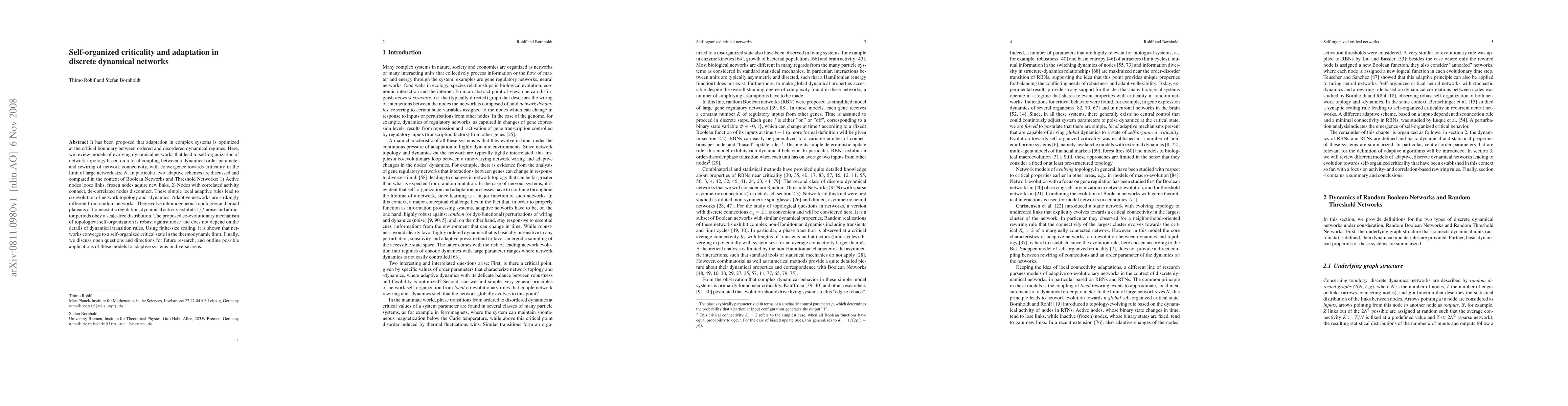 It has been proposed that adaptation in complex systems is optimized at the critical boundary between ordered and disordered dynamical regimes. Here, we review models of evolving dynamical networks that lead to self-organization of network topology based on a local coupling between a dynamical order parameter and rewiring of network connectivity, with convergence towards criticality in the limit of large network size $N$. In particular, two adaptive schemes are discussed and compared in the context of Boolean Networks and Threshold Networks: 1) Active nodes loose links, frozen nodes aquire new links, 2) Nodes with correlated activity connect, de-correlated nodes disconnect. These simple local adaptive rules lead to co-evolution of network topology and -dynamics. Adaptive networks are strikingly different from random networks: They evolve inhomogeneous topologies and broad plateaus of homeostatic regulation, dynamical activity exhibits $1/f$ noise and attractor periods obey a scale-free distribution. The proposed co-evolutionary mechanism of topological self-organization is robust against noise and does not depend on the details of dynamical transition rules. Using finite-size scaling, it is shown that networks converge to a self-organized critical state in the thermodynamic limit. Finally, we discuss open questions and directions for future research, and outline possible applications of these models to adaptive systems in diverse areas.