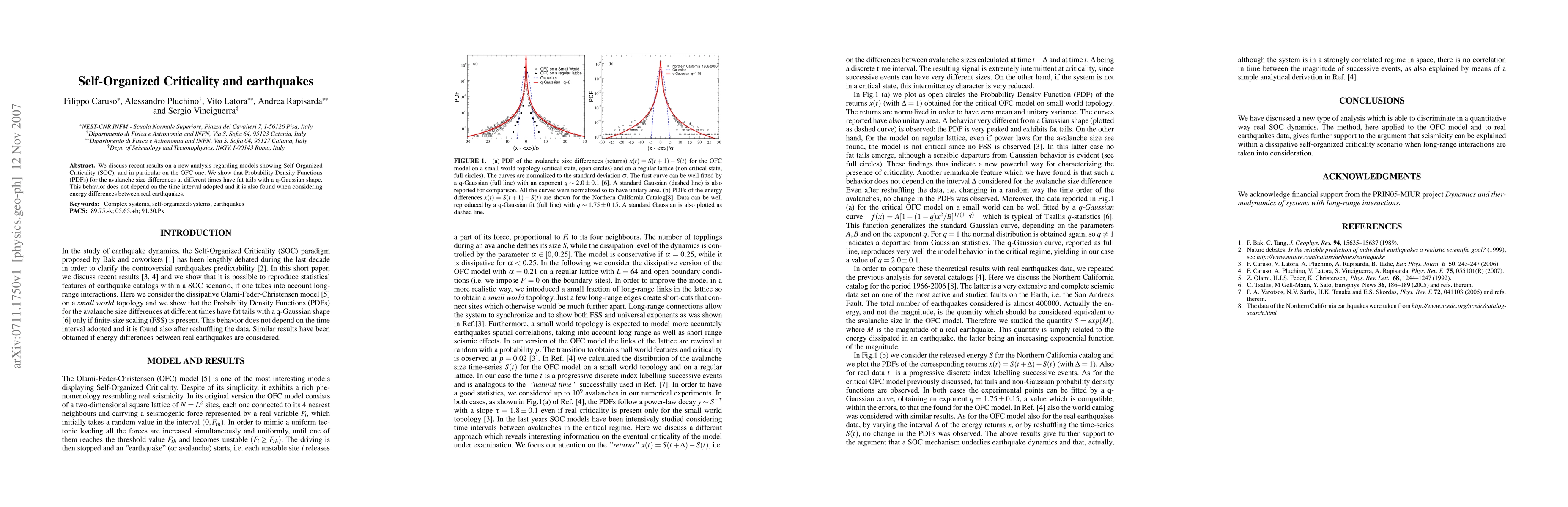 We discuss recent results on a new analysis regarding models showing Self-Organized Criticality (SOC), and in particular on the OFC one. We show that Probability Density Functions (PDFs) for the avalanche size differences at different times have fat tails with a q-Gaussian shape. This behavior does not depend on the time interval adopted and it is also found when considering energy differences between real earthquakes.
