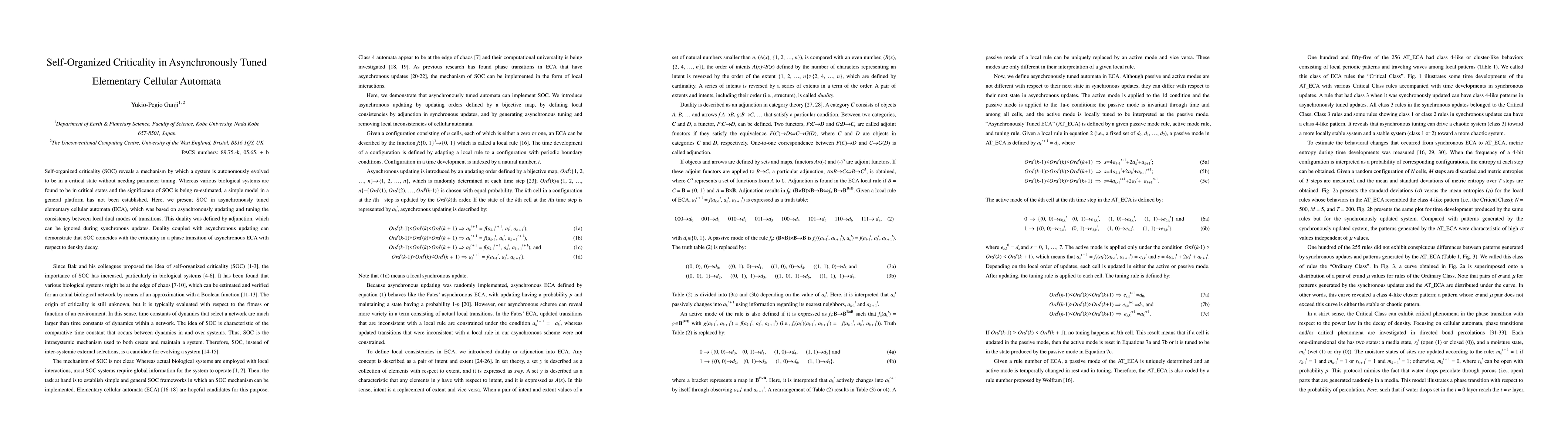 This paper explores self-organized criticality (SOC) in asynchronously tuned elementary cellular automata (ECA), demonstrating that SOC can emerge without parameter tuning through asynchronous updating and dual mode transitions. The study finds that SOC aligns with criticality in the phase transition of these ECAs concerning density decay.