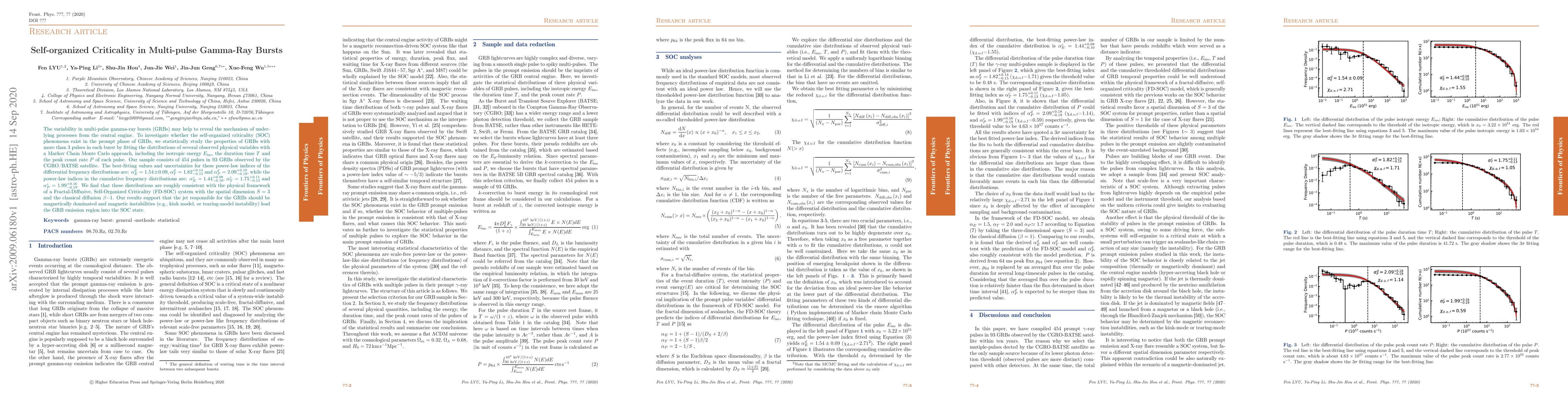 This study investigates the self-organized criticality (SOC) in multi-pulse gamma-ray bursts (GRBs) using statistical analysis of 454 pulses from 93 GRBs. The findings suggest that the observed distributions align with a Fractal-Diffusive, Self-Organized Criticality system, indicating a magnetically dominated jet and magnetic instabilities driving the GRB emission region into a critical state.