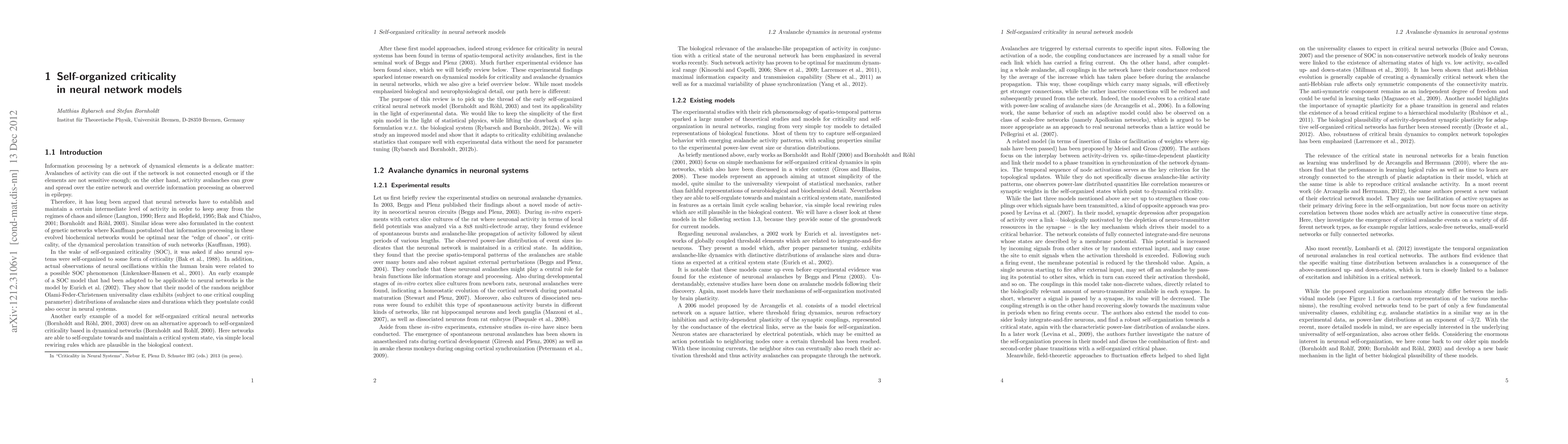 This paper reviews theoretical models of self-organized criticality in neural networks, focusing on an improved model by Rybarsch and Bornholdt (2012b) that adapts to criticality without parameter tuning, showing avalanche statistics comparable to experimental data. The study highlights the model's simplicity and effectiveness in mimicking observed critical dynamics.