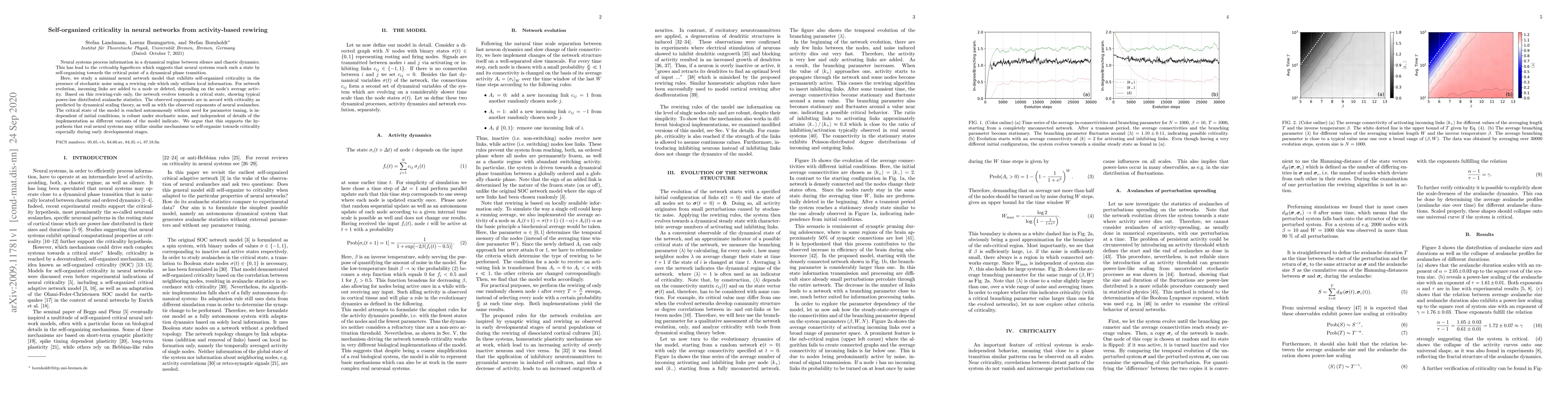This paper investigates a neural network model that achieves self-organized criticality through an activity-based rewiring rule, demonstrating power-law distributed avalanche statistics akin to those observed in neural systems. The model autonomously reaches a critical state without parameter tuning, supporting the hypothesis that neural systems may self-organize towards criticality during development.
