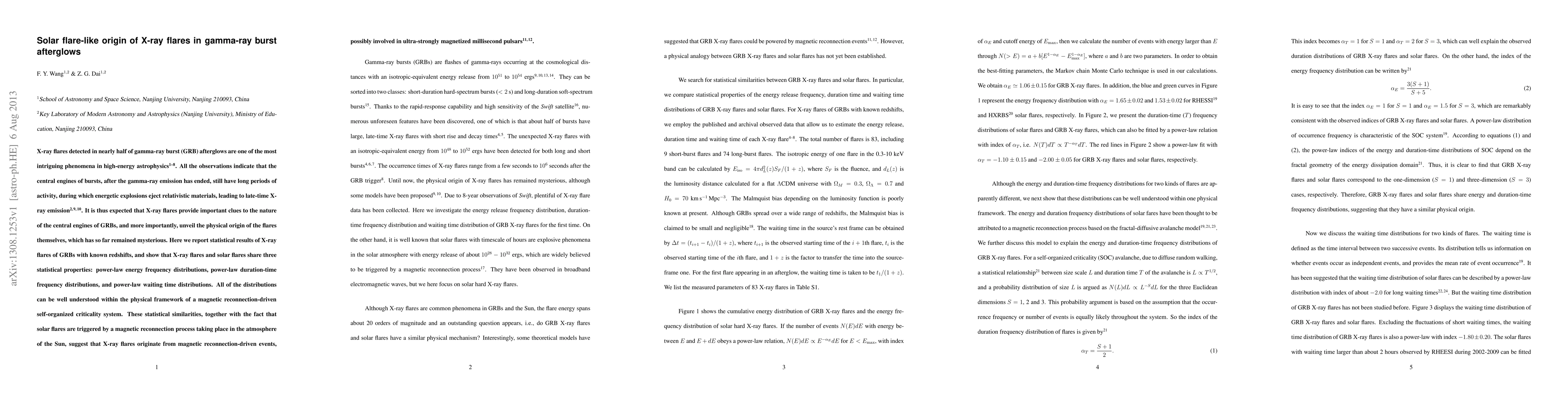 This paper investigates the statistical properties of X-ray flares in gamma-ray burst afterglows, finding they share three key properties with solar flares: power-law distributions for energy, duration, and waiting times. These similarities suggest both X-ray flares and solar flares operate under a self-organized criticality framework, likely driven by magnetic reconnection processes.