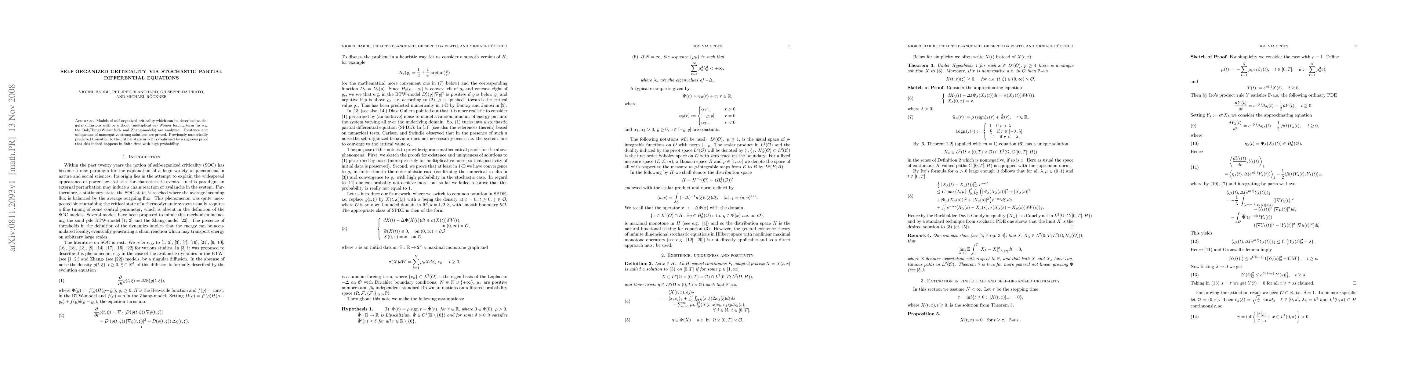 This paper proves the existence and uniqueness of nonnegative strong solutions for models of self-organized criticality described by stochastic partial differential equations. It rigorously confirms the previously numerically predicted transition to the critical state in one-dimensional systems, showing it occurs in finite time with high probability.