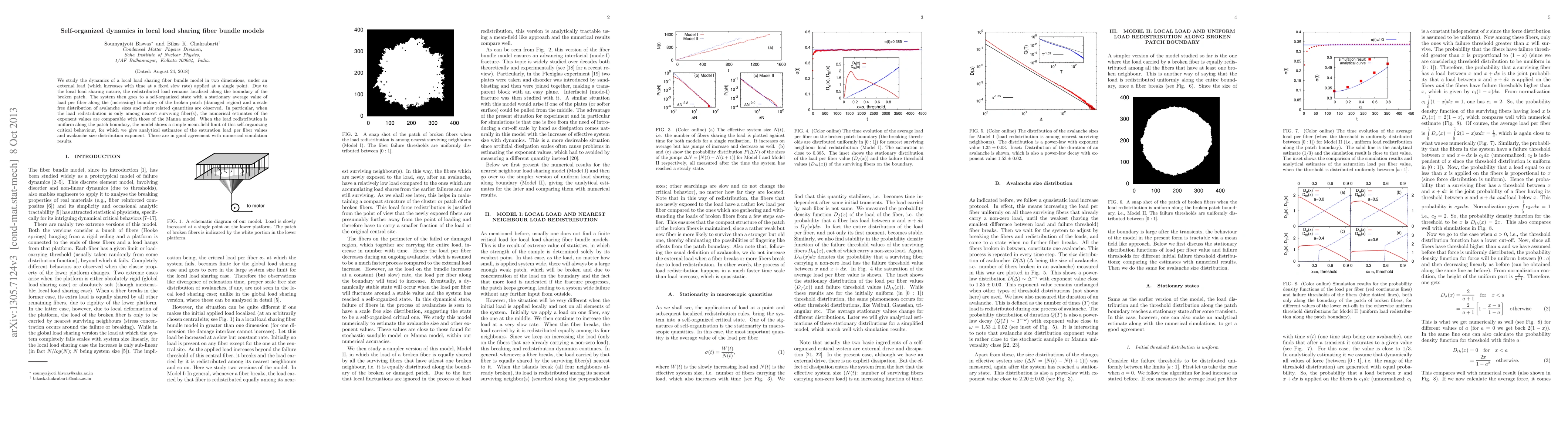 We study the dynamics of a local load sharing fiber bundle model in two dimensions, under an external load (which increases with time at a fixed slow rate) applied at a single point. Due to the local load sharing nature, the redistributed load remains localized along the boundary of the broken patch. The system then goes to a self-organized state with a stationary average value of load per fiber along the (increasing) boundary of the broken patch (damaged region) and a scale free distribution of avalanche sizes and other related quantities are observed. In particular, when the load redistribution is only among nearest surviving fiber(s), the numerical estimates of the exponent values are comparable with those of the Manna model. When the load redistribution is uniform along the patch boundary, the model shows a simple mean-field limit of this self-organizing critical behaviour, for which we give analytical estimates of the saturation load per fiber values and avalanche size distribution exponent. These are in good agreement with numerical simulation results.