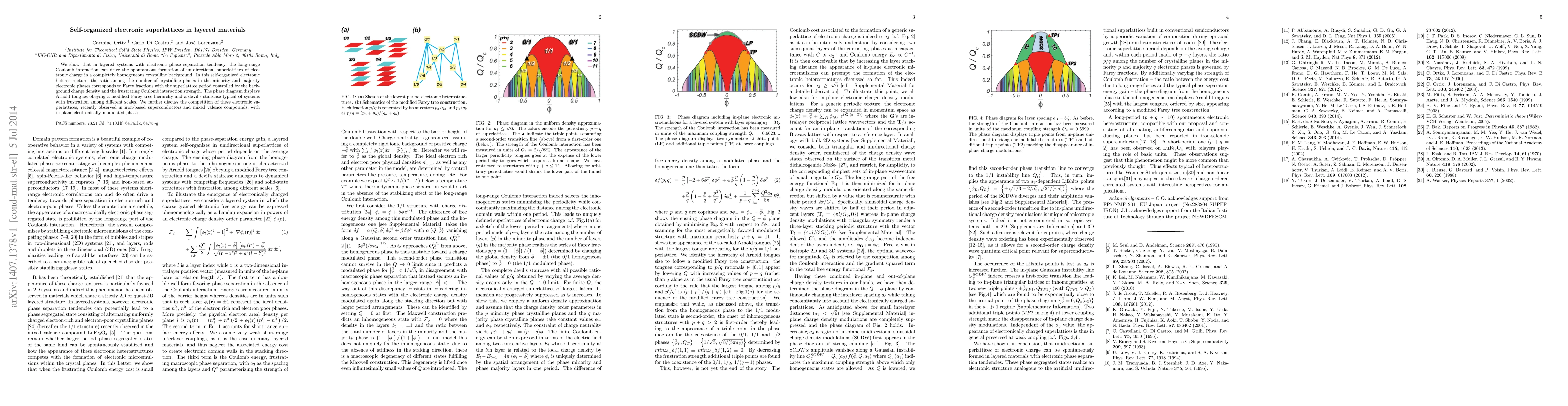 We show that in layered systems with electronic phase separation tendency, the long-range Coulomb interaction can drive the spontaneous formation of unidirectional superlattices of electronic charge in a completely homogeneous crystalline background. In this self-organized electronic heterostructure, the ratio among the number of crystalline planes in the minority and majority electronic phases corresponds to Farey fractions with the superlattice period controlled by the background charge density and the frustrating Coulomb interaction strength. The phase diagram displays Arnold tongues obeying a modified Farey tree hierarchy and a devil's staircase typical of systems with frustration among different scales. We further discuss the competition of these electronic superlattices, recently observed in iron-based superconductors and mixed valence compounds, with in-plane electronically modulated phases.