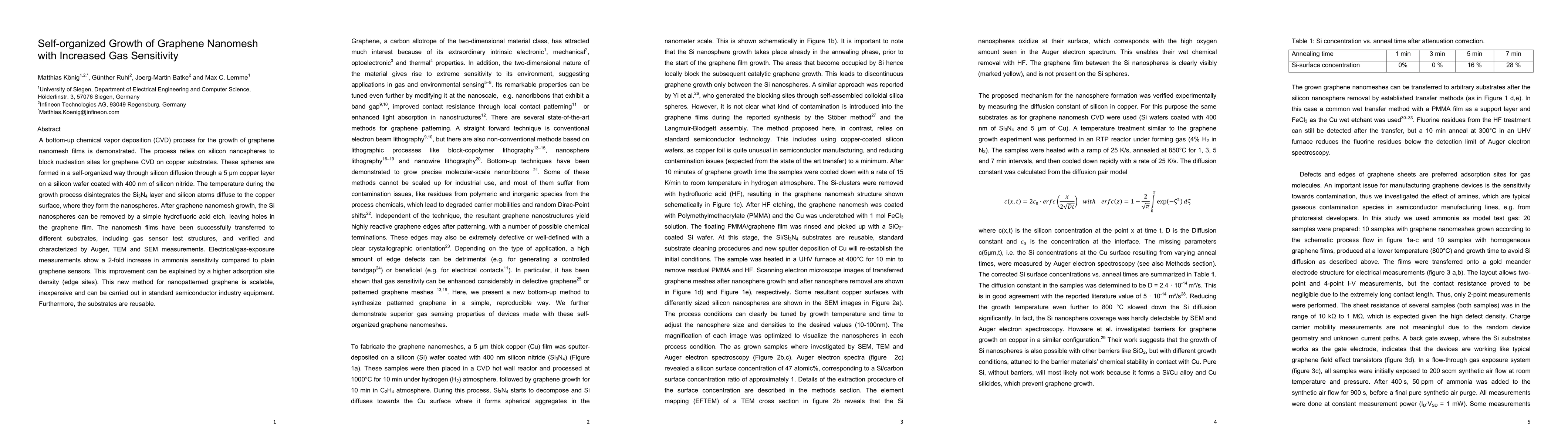 The paper details a bottom-up CVD process to create graphene nanomesh films using self-organized silicon nanospheres, which improves ammonia sensitivity by 2-fold due to increased edge adsorption sites. The method is scalable, cost-effective, and employs reusable substrates.