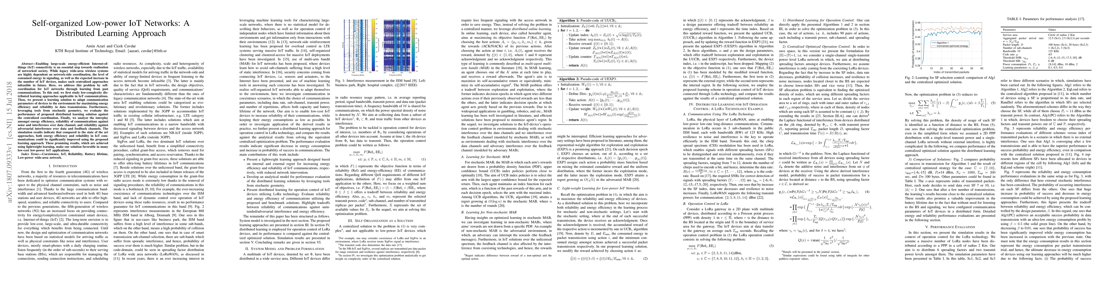 This paper proposes a distributed learning approach for self-organized, low-power IoT networks to enhance energy efficiency and reliability without centralized coordination. Simulation results show significant improvements over existing methods, making the approach suitable for low-cost, low-power IoT applications.